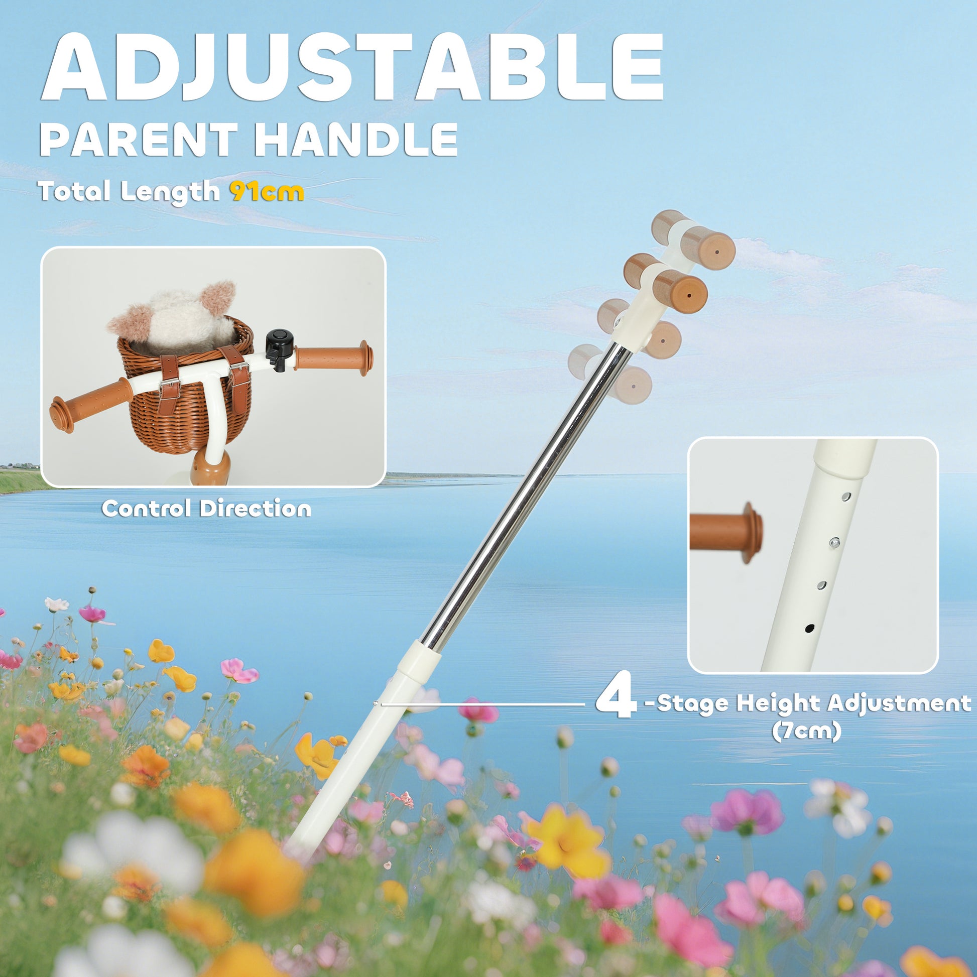 - Push Handle Length: 91cm (total) (adjustable by 7cm), 48cm (upper), 51cm (lower)