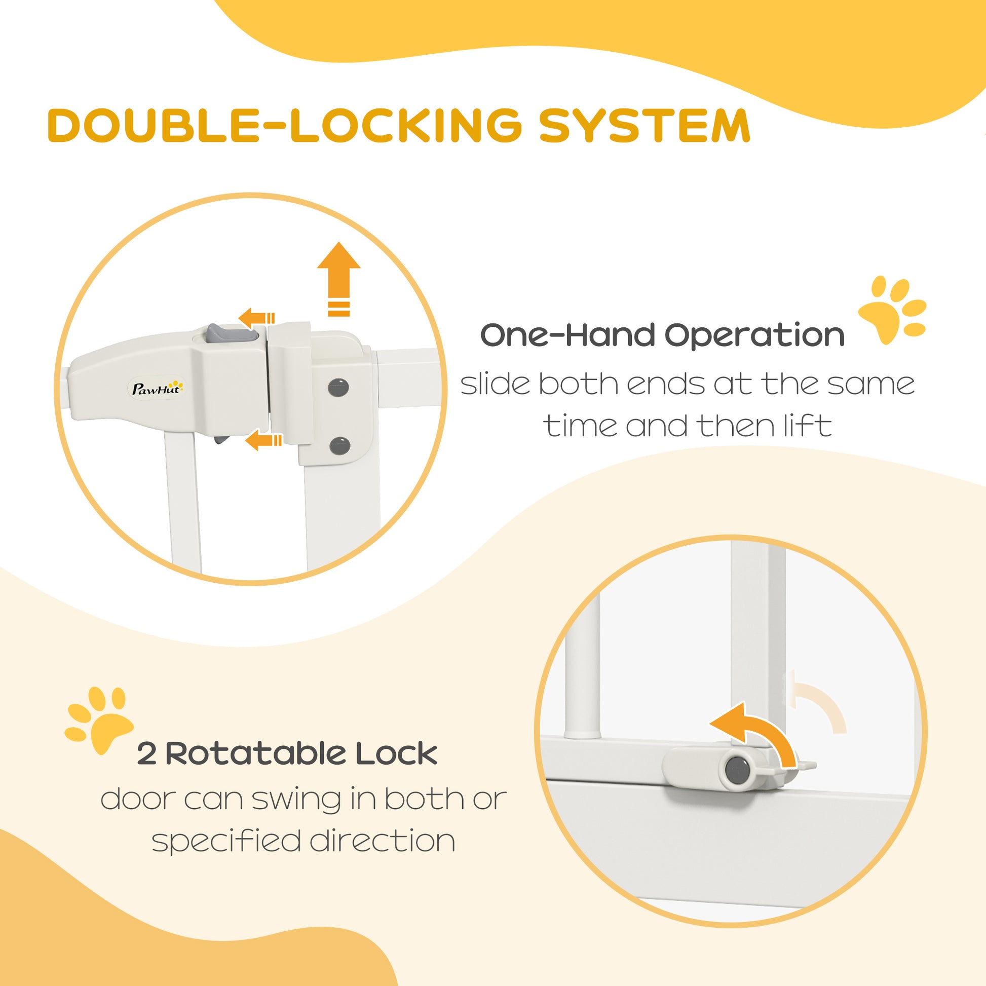 - EASY DOUBLE-LOCKING SYSTEM: Ensures extra security to keep the door closed. To open, simply slide the two buttons simultaneously and lift. Door can be set to open both ways or in just specific direction.