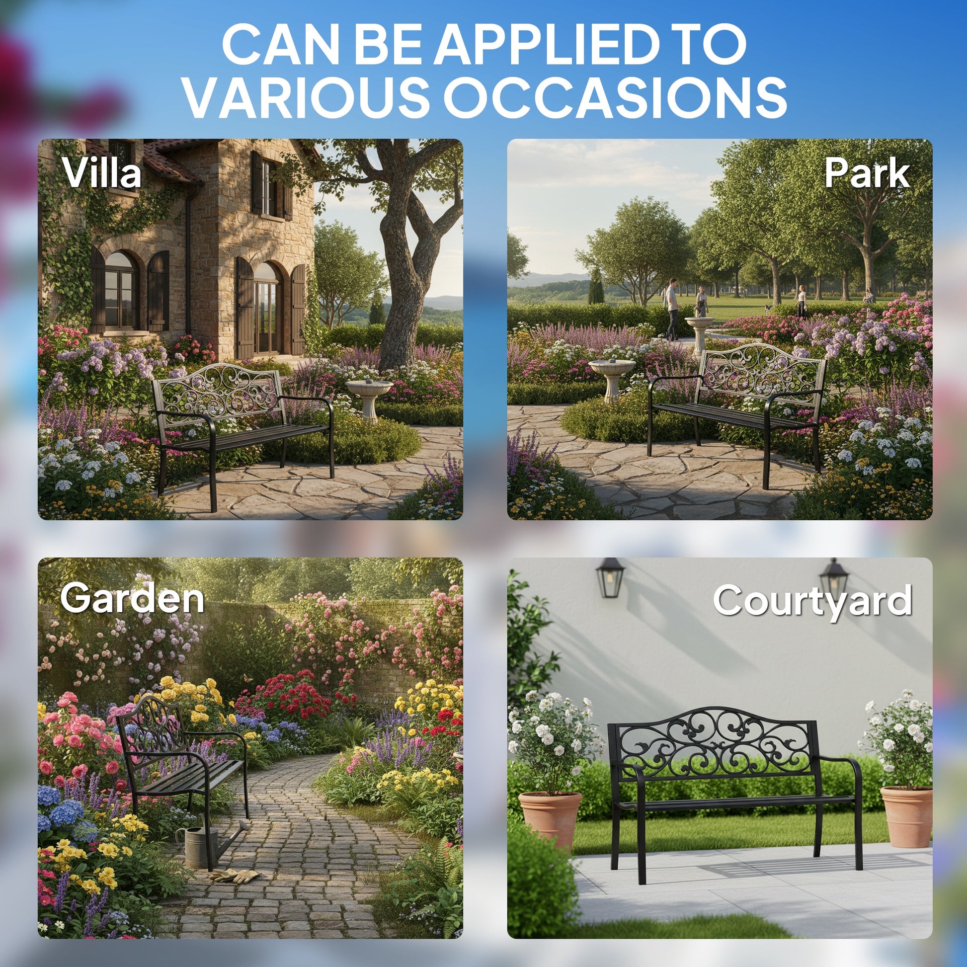 Metal Garden Bench, Outdoor Bench with Floral Back, Black