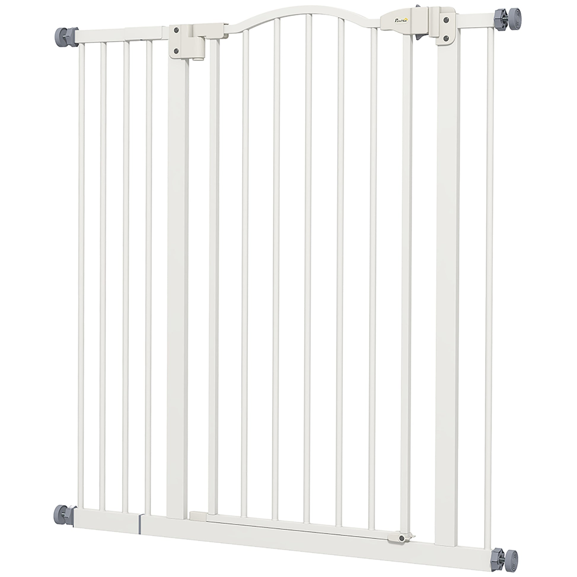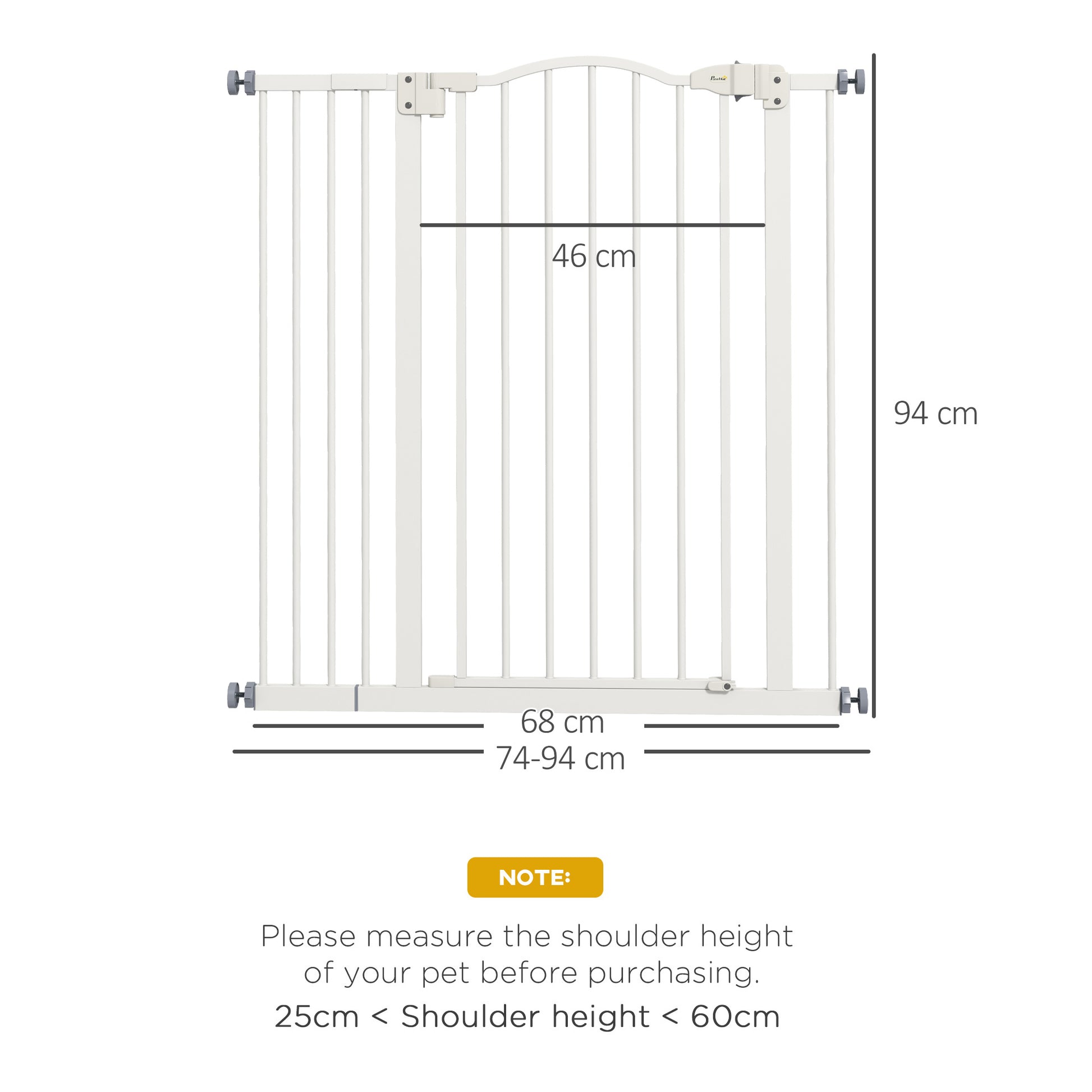 Keep pets away from specific places easily with this safety gate . It's made from metal for strength, and its width can be adjusted between 74cm and 94cm, meaning it will fit properly in door frames and other passages. Fitted with a middle door to pass when needed, the slide-and-lift handle is easy to use so you can walk through quickly. Two rotating locks on the bottom allow the door to opened both ways, with a double locking mechanism to finish for extra safety.