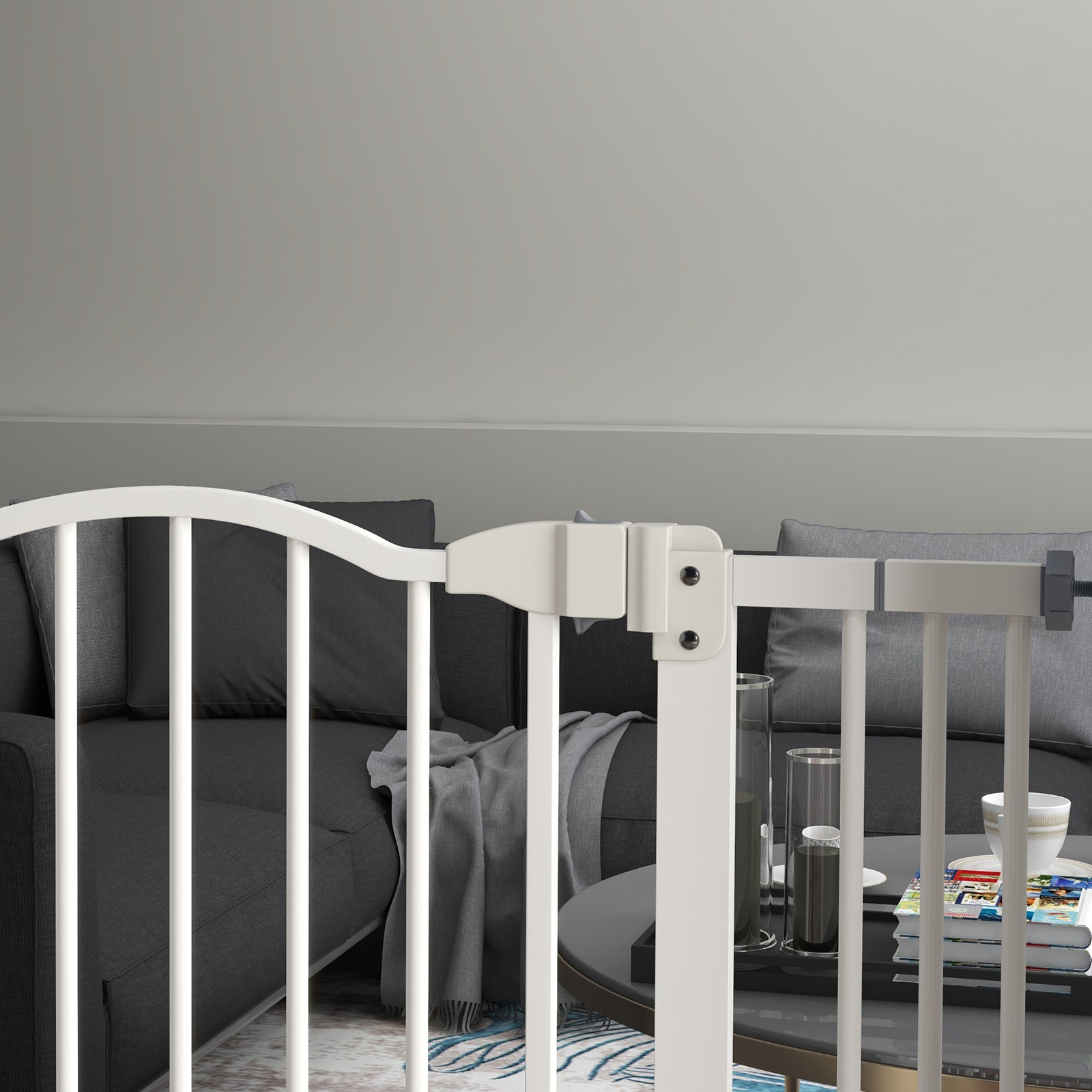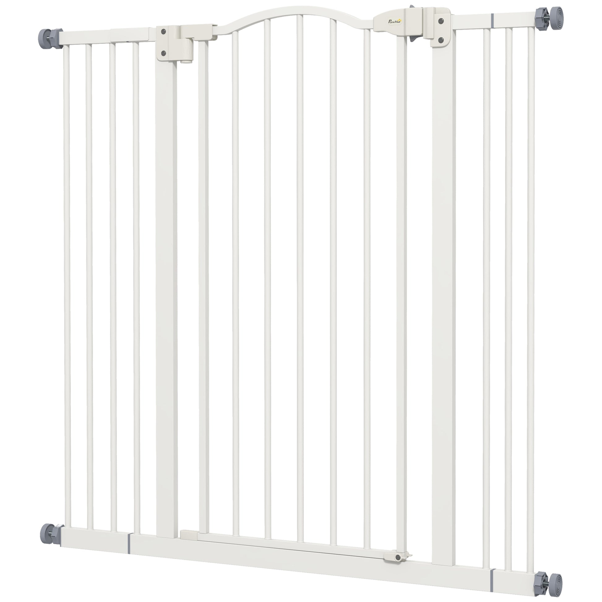 Keep pets away from specific places easily with this safety gate . It's made from metal for strength, and its width can be adjusted between 74cm and 100cm, meaning it will fit properly in door frames and other passages. Fitted with a middle door to pass when needed, the slide-and-lift handle is easy to use so you can walk through quickly. Two rotating locks on the bottom allow the door to opened both ways, with a double locking mechanism to finish for extra safety.