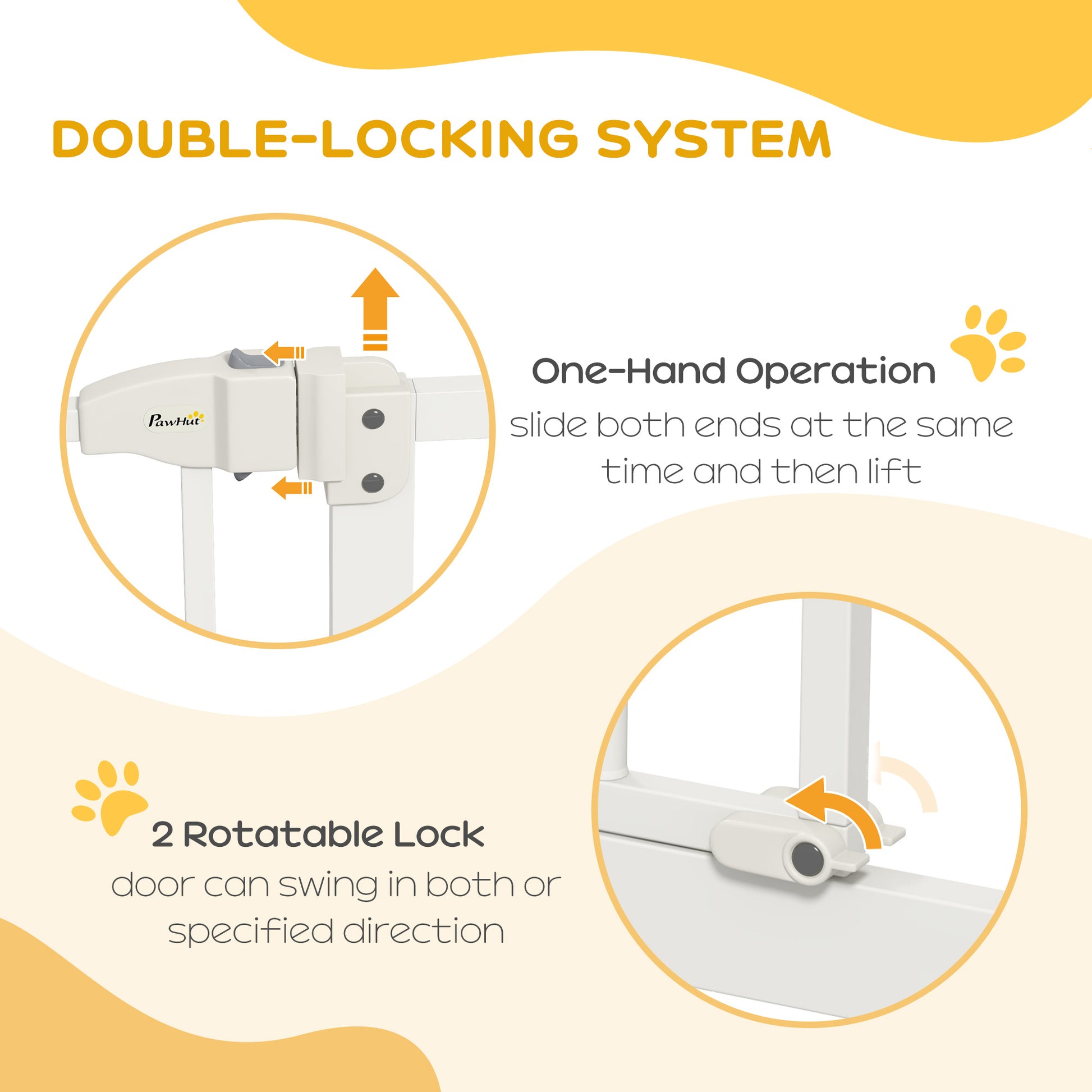 - EASY DOUBLE-LOCKING SYSTEM: Ensures extra security to keep the door closed. To open, simply slide the two buttons simultaneously and lift. Door can be set to open both ways or in just specific direction.