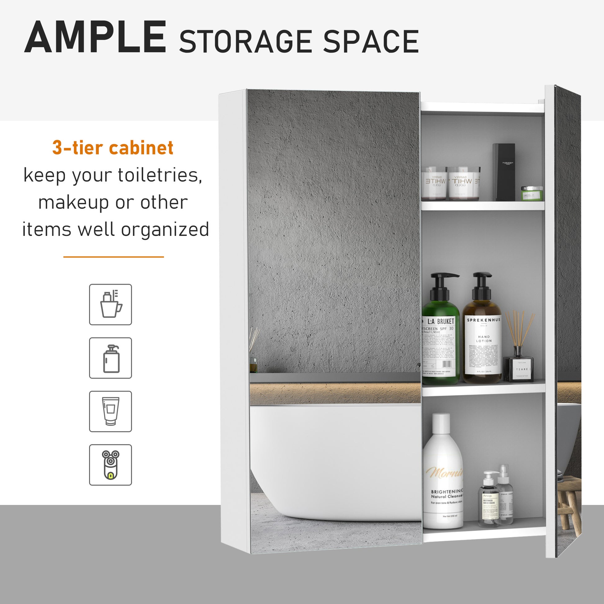 This stylish wall mounted mirror cabinet is a perfect necessity for any bathroom. Made of sturdy MDF and designed with double mirrored doors, it provides great storage space for your daily essentials. With an adjustable shelf, it can accommodate most articles you have. This HOMCOM mirror cabinet is absolutely a perfect solution for any bathroom.