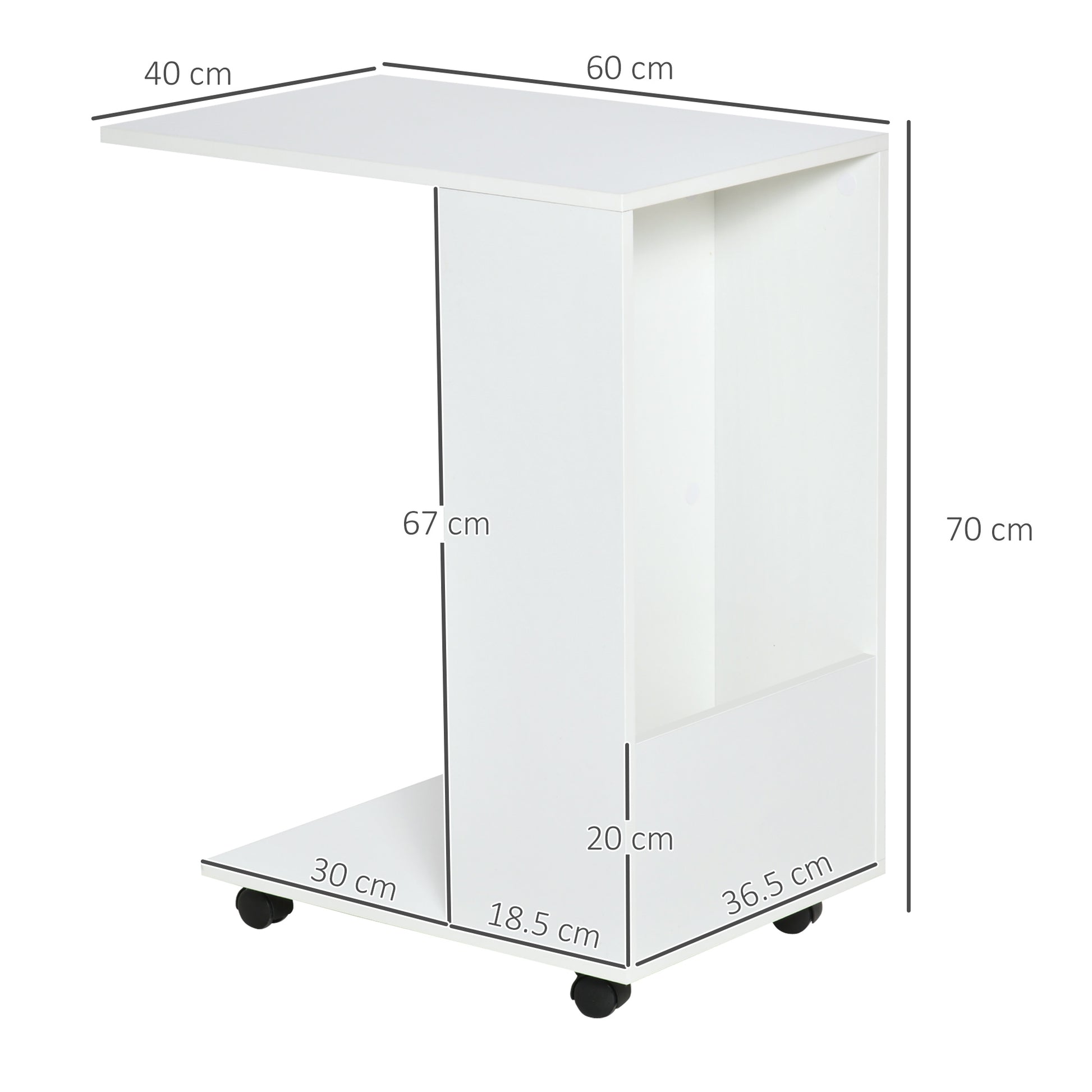 A practical side table for your home, which can be moved around easily, comes in the form of this piece from HOMCOM. 'C' means it can be moved over your sofa, bed and similar spots, with the four castor wheels making moving smooth and easy. Features a table top, bottom shelf and back shelf for moderate amount of storage. Simply pull to you, and use!