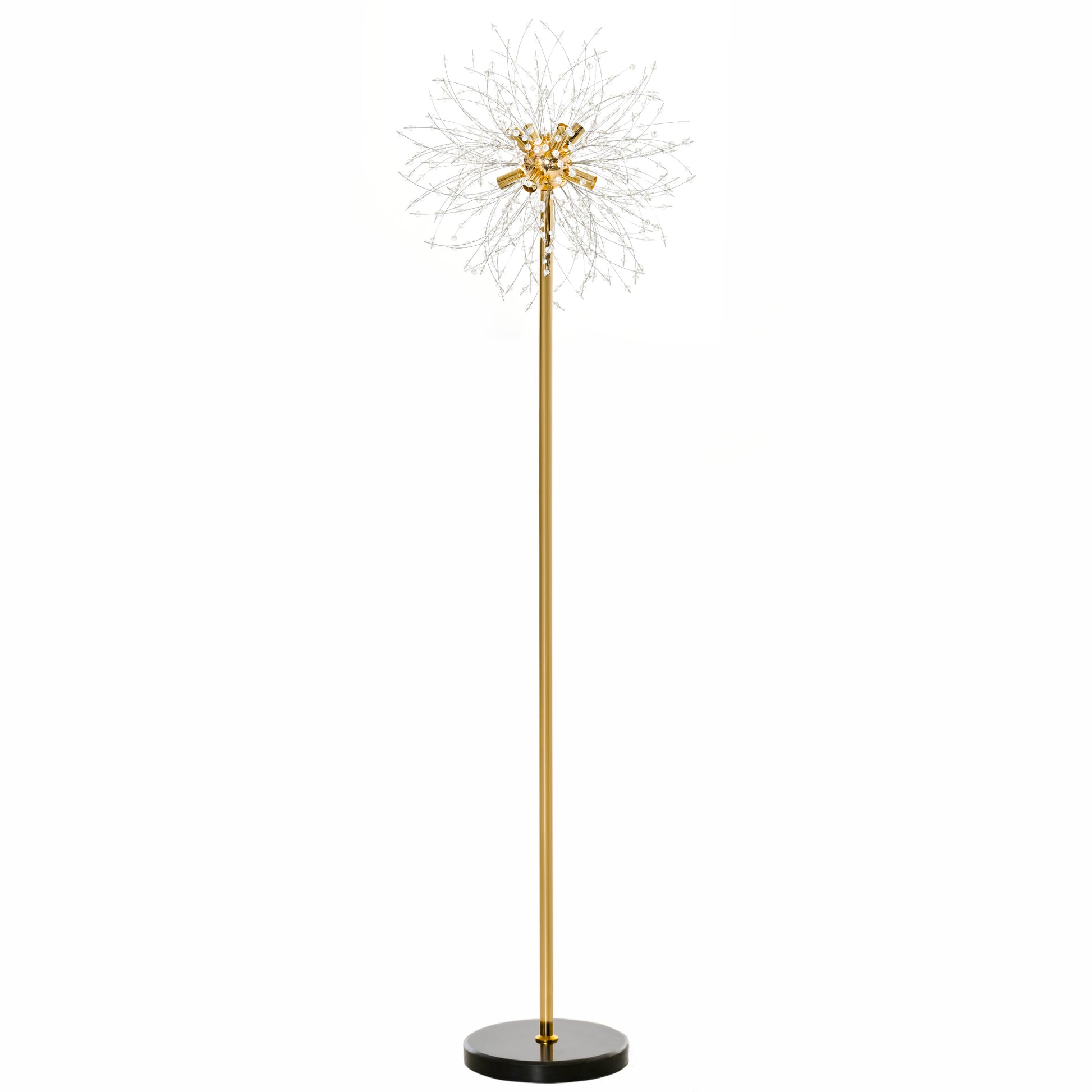 Elegant home decoration with this floor lamp. A dandelion/firework flower design, where all strands are fitted with crystallite beads - catches the light and sparkles. A metal frame for a strong core, finished in a gold tone for extra elegance. Complete with a foot switch to turn on/off, and a marble base to keep weighted.