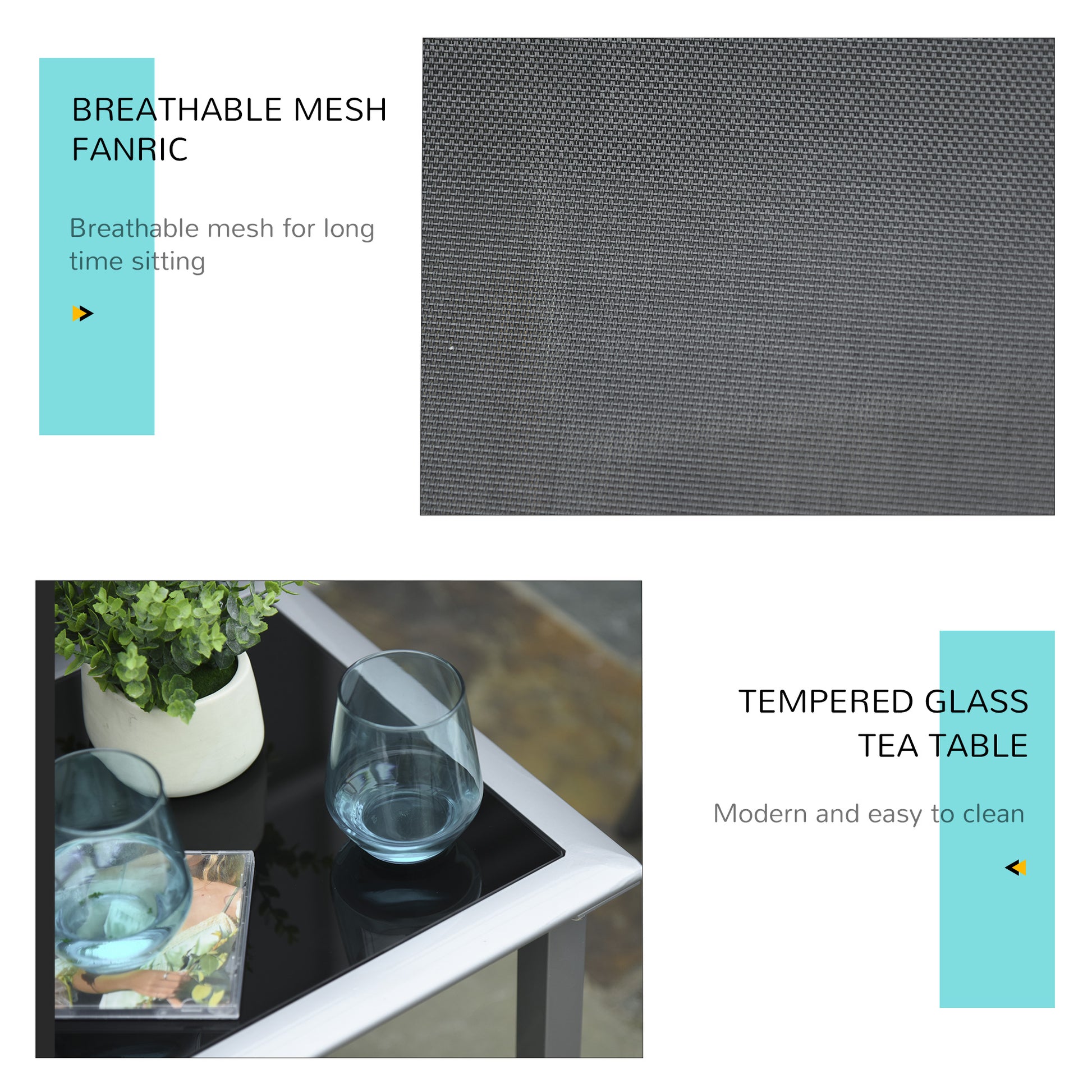 Refresh your outdoor space with the garden recliner chairs set of 3 Outsunny. Using metal for the frame of both chairs and a table, the structure is tough and durable, so it can be used every day. The sun loungers for garden are wrapped in breathable mesh for comfort and smoothness on the skin. The table comes with a thick glass top for a safe and secure holding place. Stylish and functional, this set is perfect for patios, gardens, balconies and any other outdoor space. Assembly is required.