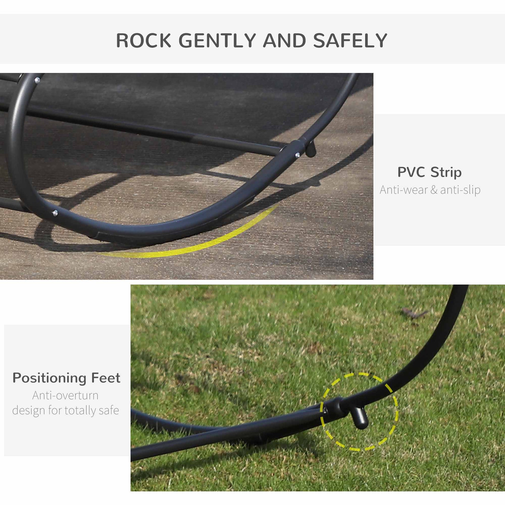 Double the relaxation with this two-person rocking bed from Outsunny. The metal frame is strong for full support, crafted into a curved zero-gravity shape, rocking forwards and backwards gently. The texteline seat holds you properly, and there's a top pillow for comfort. Seat is water-resistant to keep it lightly dry. Take your outdoor relaxation to a new level.