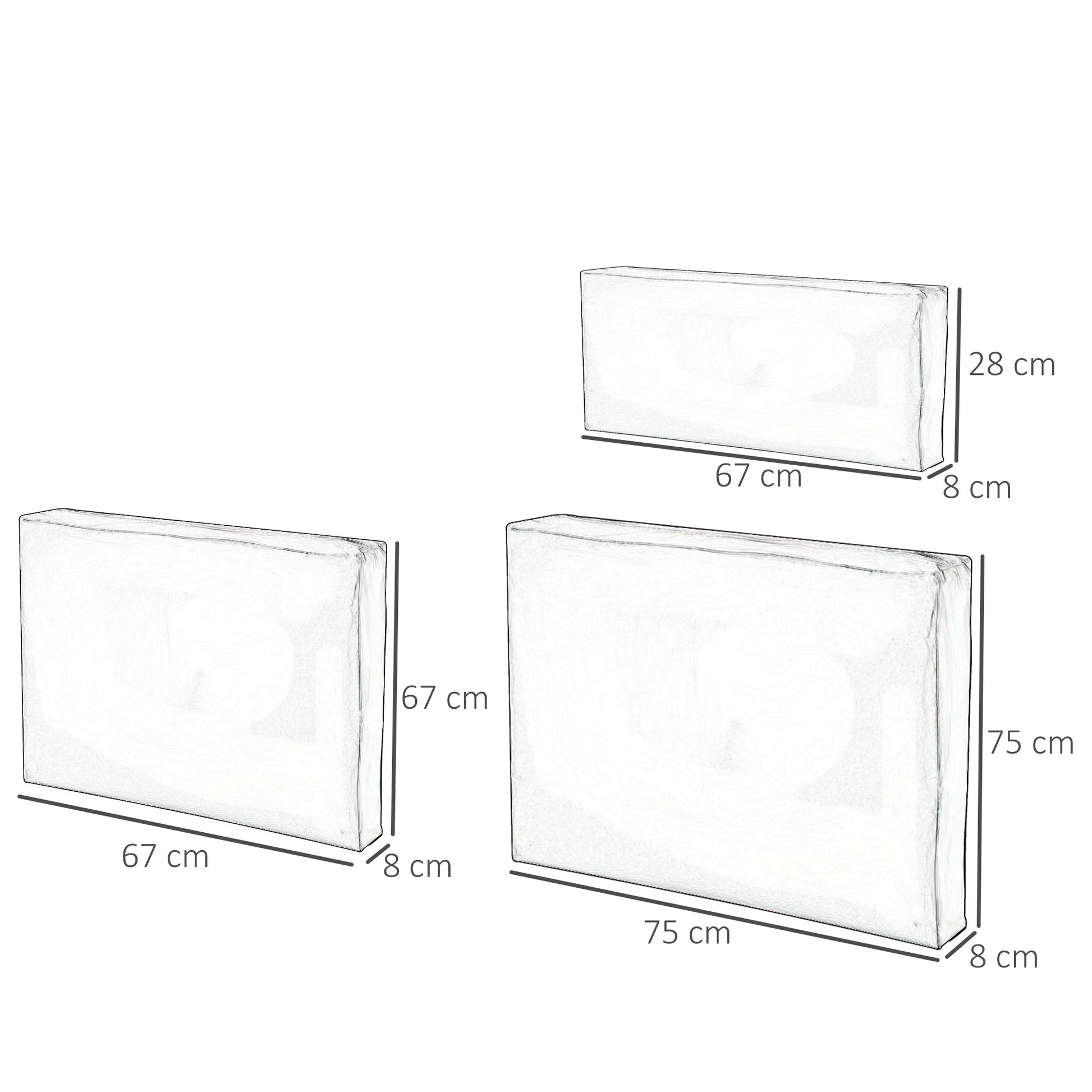 - Dimensions: Small Seat Cushion: 67L x 67W x 8Dcm. Big Seat Cushion: 75L x 75W x 8Dcm. Back Cushion: 67W x 28H x 8Dcm