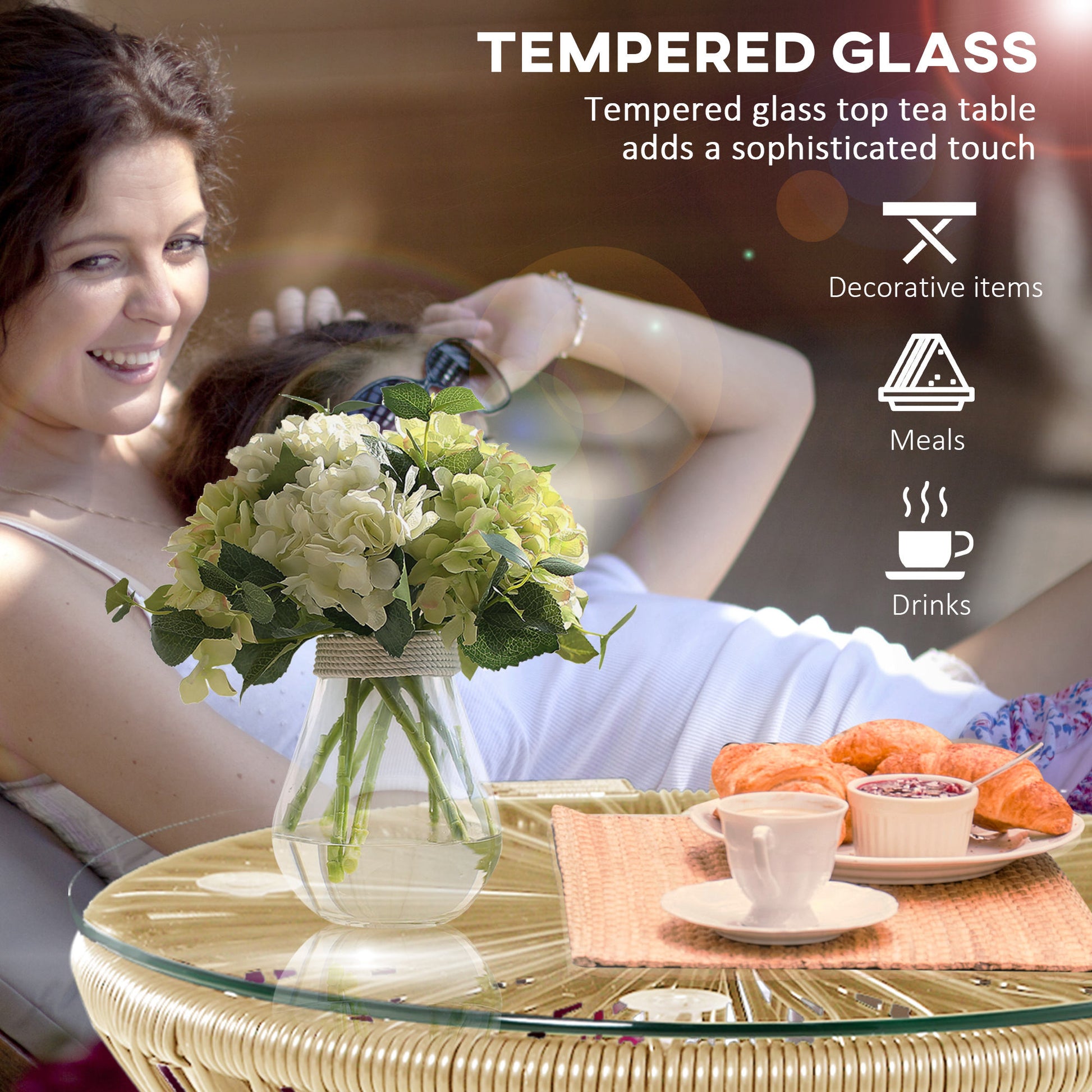 This Outsunny garden table is twist on your standard rattan designs: coming in a wicker string design, this is the great update for your outdoors. A powder coated metal frame means a strong core, with the large base ensuring balance. Comes with a 5mm tempered glass tabletop for a sleek and safe holding place.Specifications