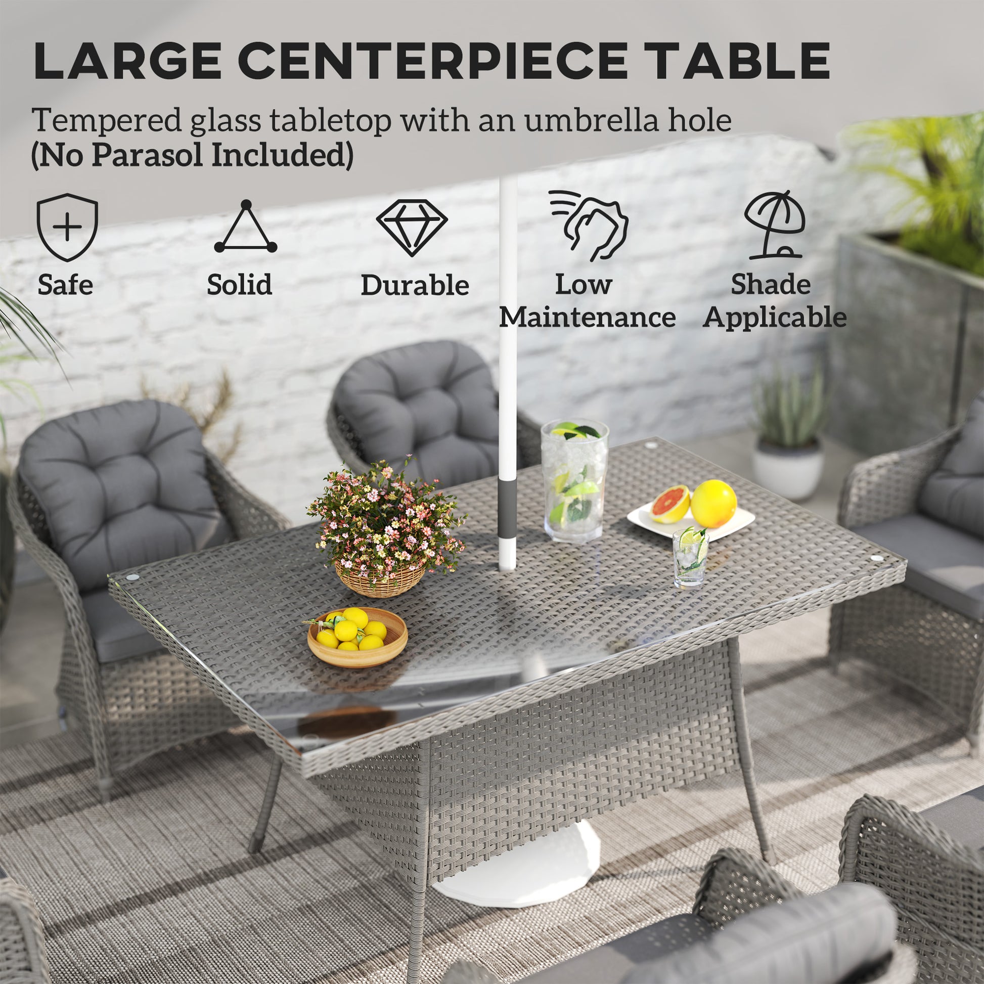 Bring everyone together outside, this season and beyond, with this Outsunny rattan garden furniture set. Includes six chairs and a large table - plenty of space for your favourite company. Each piece is made from powder coated aluminium for a strong core, wrapped in durable and stylish plastic wicker - a protective rattan shell. Keep safely shaded, thanks to the parasol hole in the glass-top table.Specifications