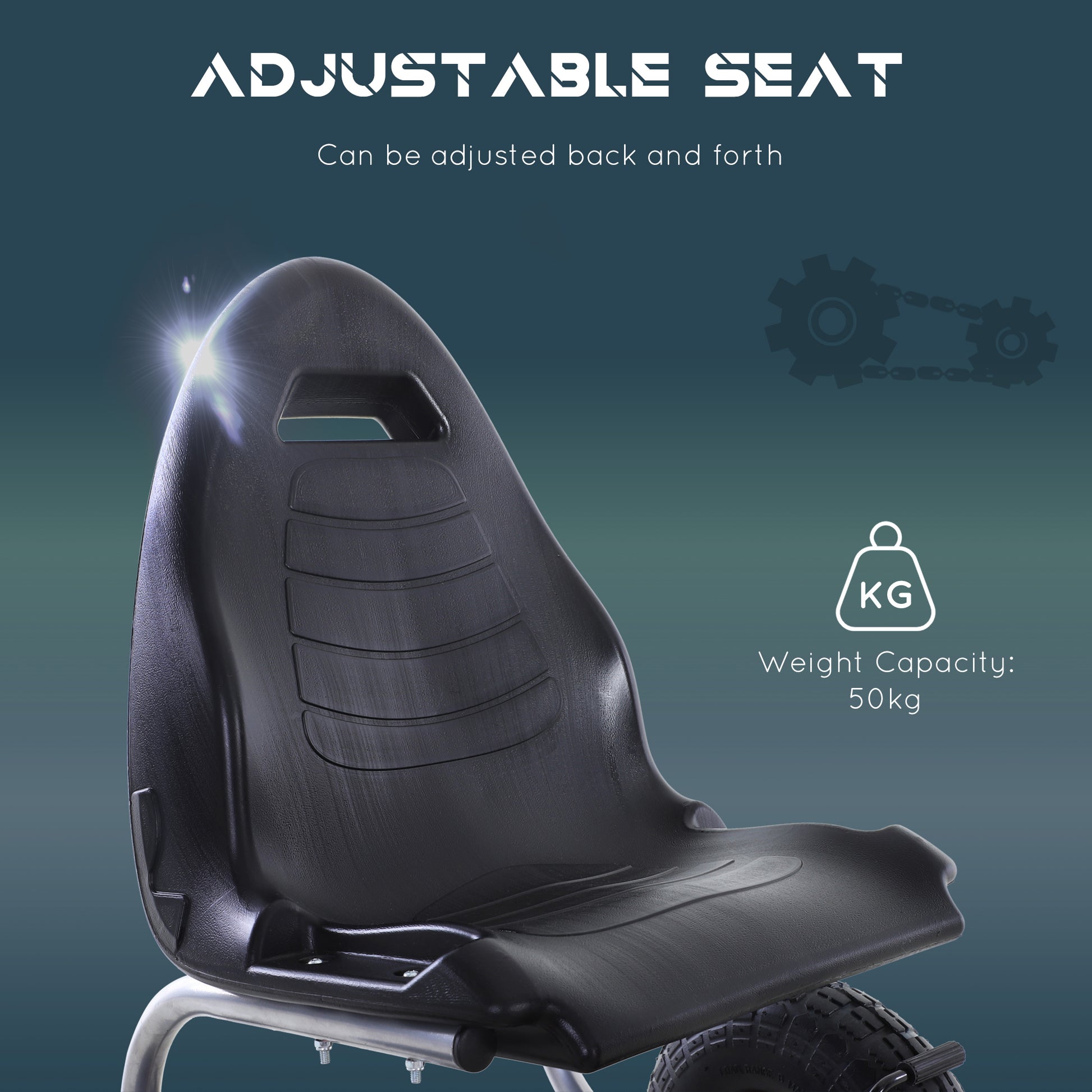 Make them the envy of their friends with this super cool go kart from HOMCOM. Made from metal, the frame is crafted into spacious, two pedal design which allows them to be in full control of the speed, featuring a wide and comfortable bucket seat, a high-rise steering wheel, a built-in hand brake and clutch and two foot pedals for the movement. Four rubber tyres ensure a smooth and safe ride, with red and black racing-style stickers all over for a cool and distinctive finish. A piece they’ll want to ride for hours.