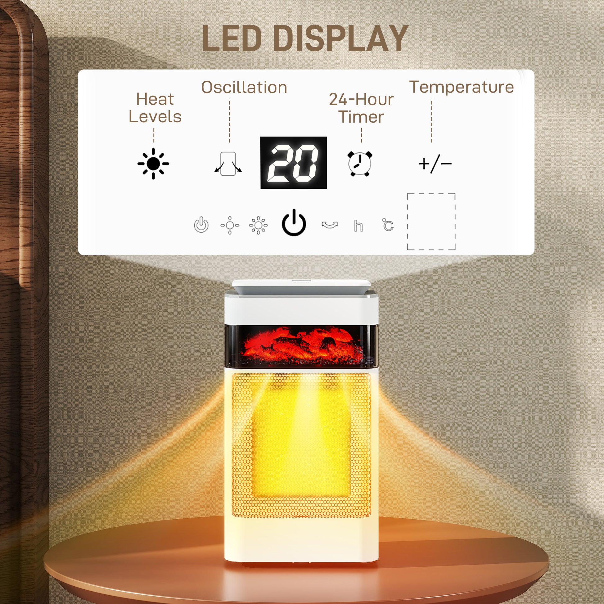 - Features a burning flame effect, creating a cosy visual warmth