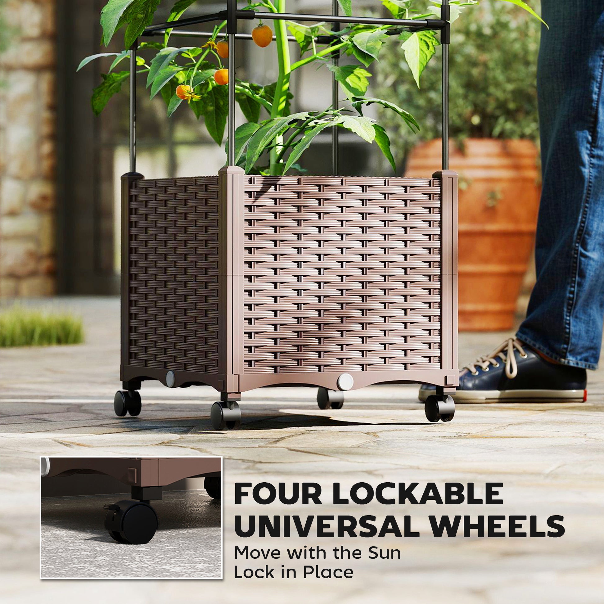 Move your garden wherever the sunlight goes with this raised planter on wheels. Its elevated design reduces bending while protecting plants from unwanted guests, and the spacious bed offers plenty of room for vegetables, herbs and flowers. Four smooth-rolling lockable wheels make repositioning effortless, and keep it steady. Suitable for patios, balconies, and small outdoor spaces.Specifications