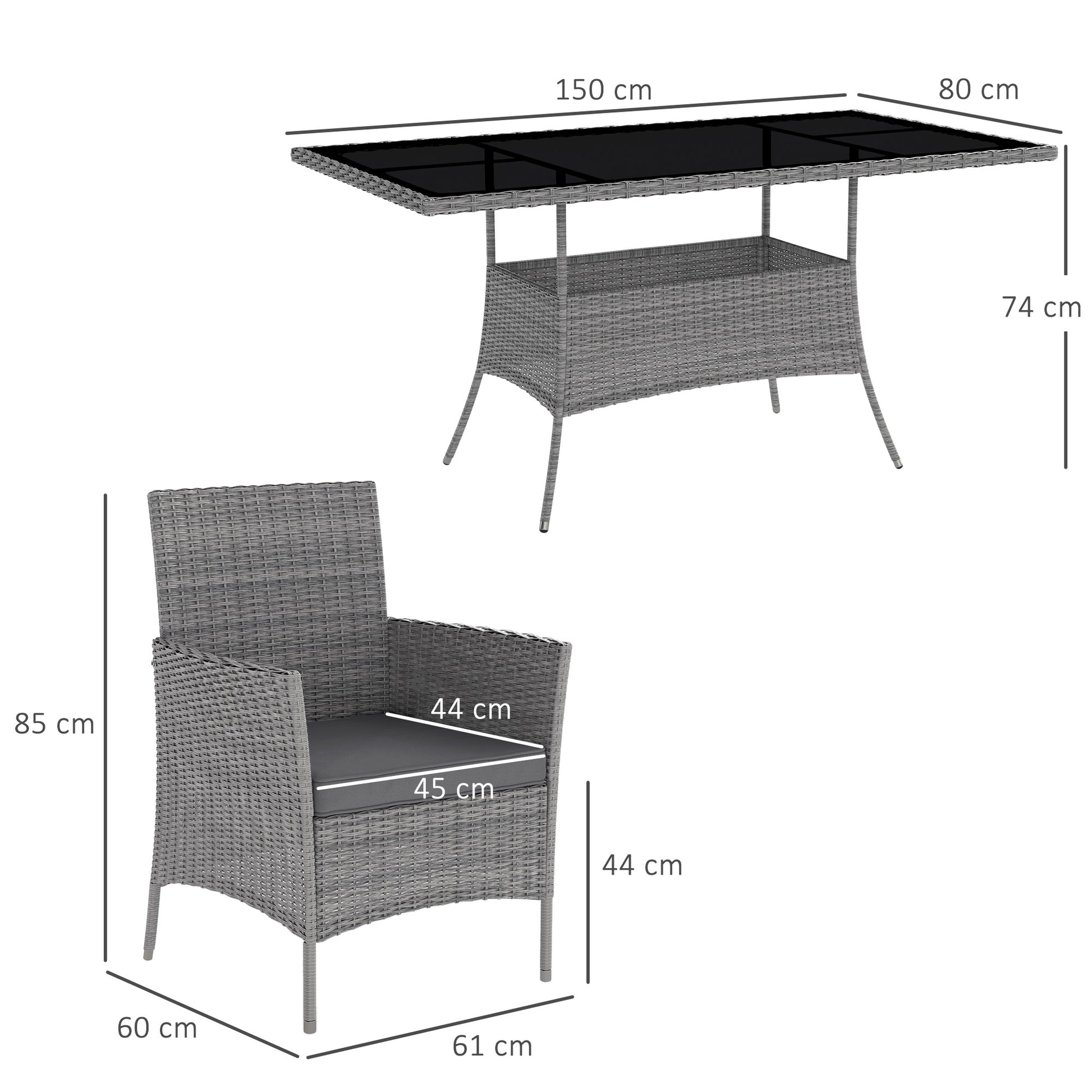 This deluxe 7-piece rattan outdoor dining set is a great addition to patio or garden, made with quality PE rattan and robust metal construction for sturdiness and long-lasting. It also comes complete with a 5 mm thick tempered glass for the table top, so you can use on a daily basis. The outdoor table and chairs are easy to maintain and keep clean using a damp cloth.Specifications
