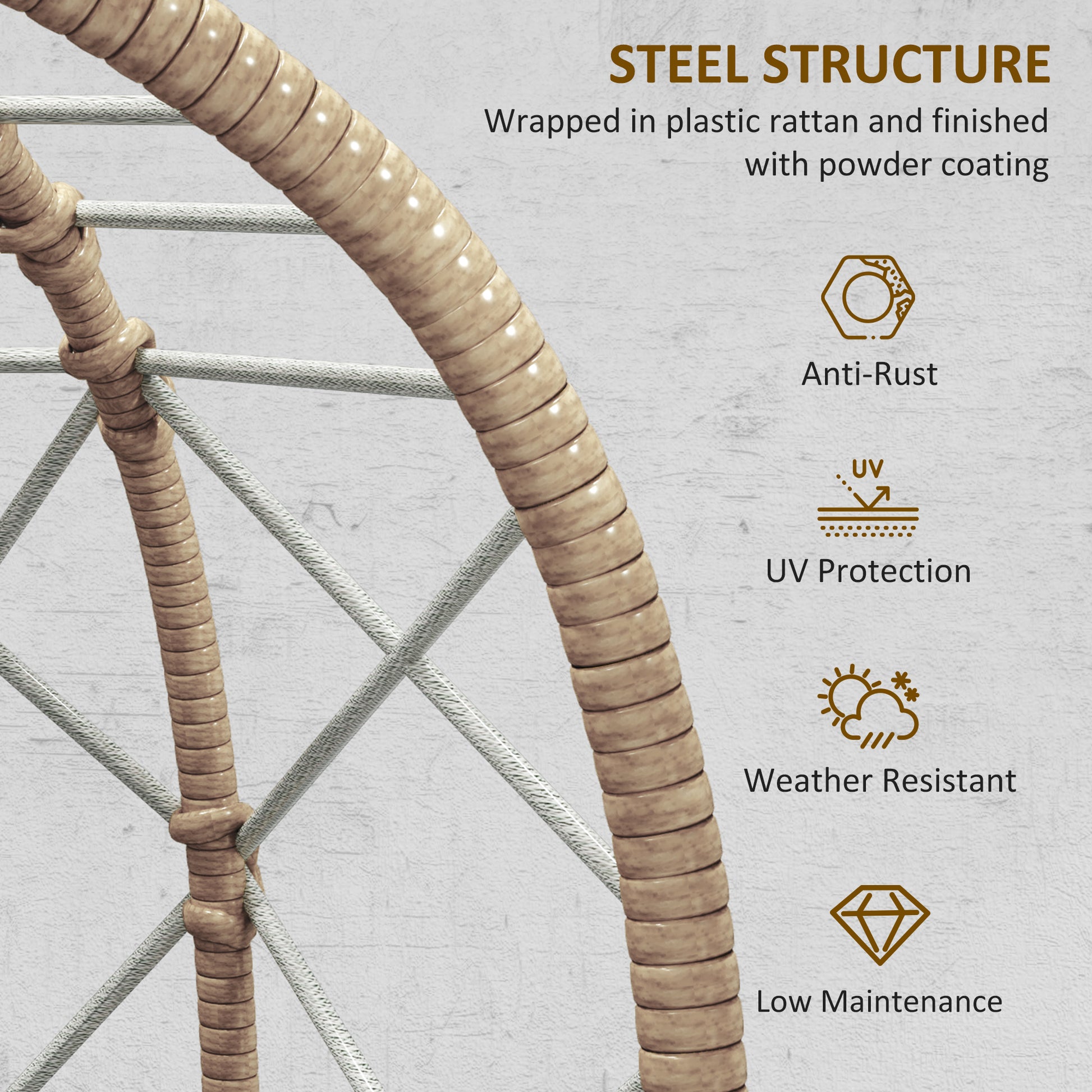 Relax in optimal comfort with this outdoor standing egg chair from Outsunny! This rattan garden chair with a rope woven hollow-out design is like a cosy bird-nest retreat. 20cm thickened cushion and a separate head pillow offer luxurious comfort. A steel frame means a strong, supportive core, whilst the outer plastic rattan wicker offers a stylish and protective top. Complete with a side cup holder for keeping drink within reach.Specifications