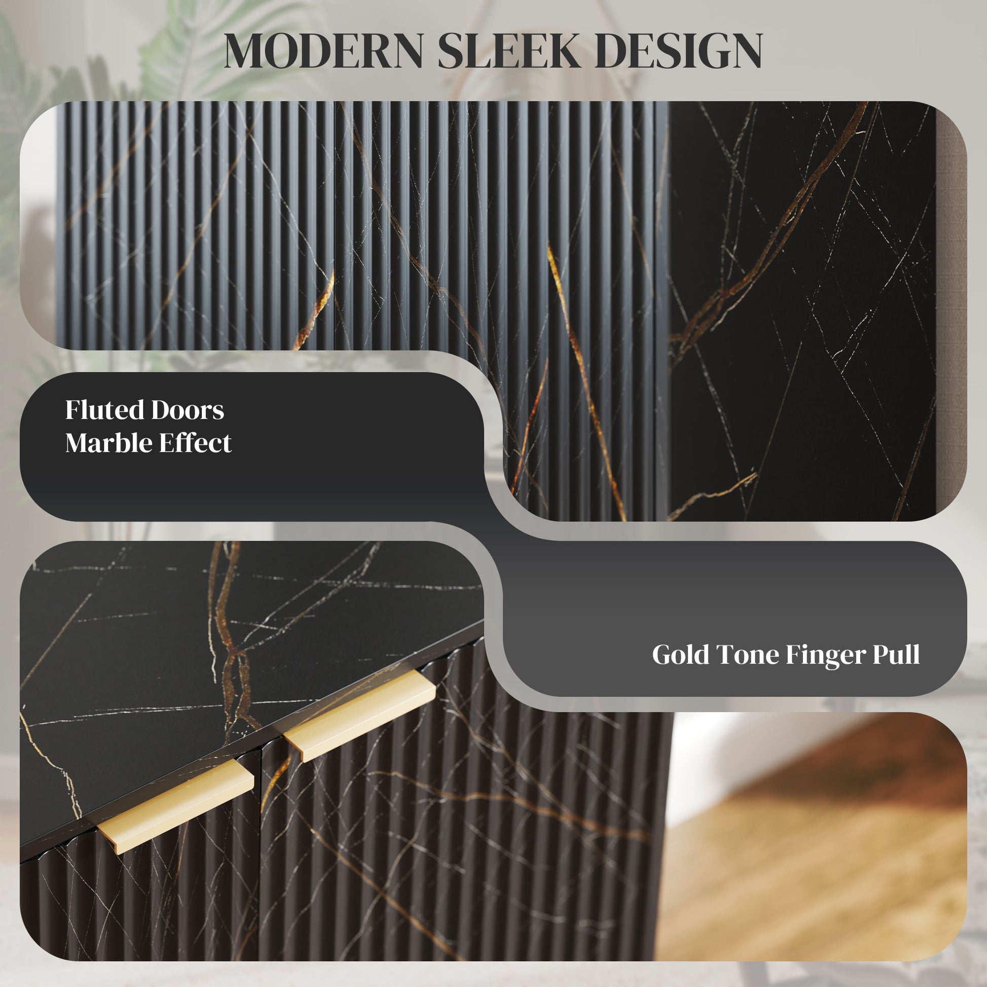 Add a soft touch of elegant texture into the bedroom and beyond, thanks to this sideboard. With two shelves, there's two compartments for keeping tableware, dining accessories and more - with a handy three-level adjustable shelf to fit in smaller and larger items. Made from a particle board and MDF blend for durability, finished with metal legs for support.Specifications