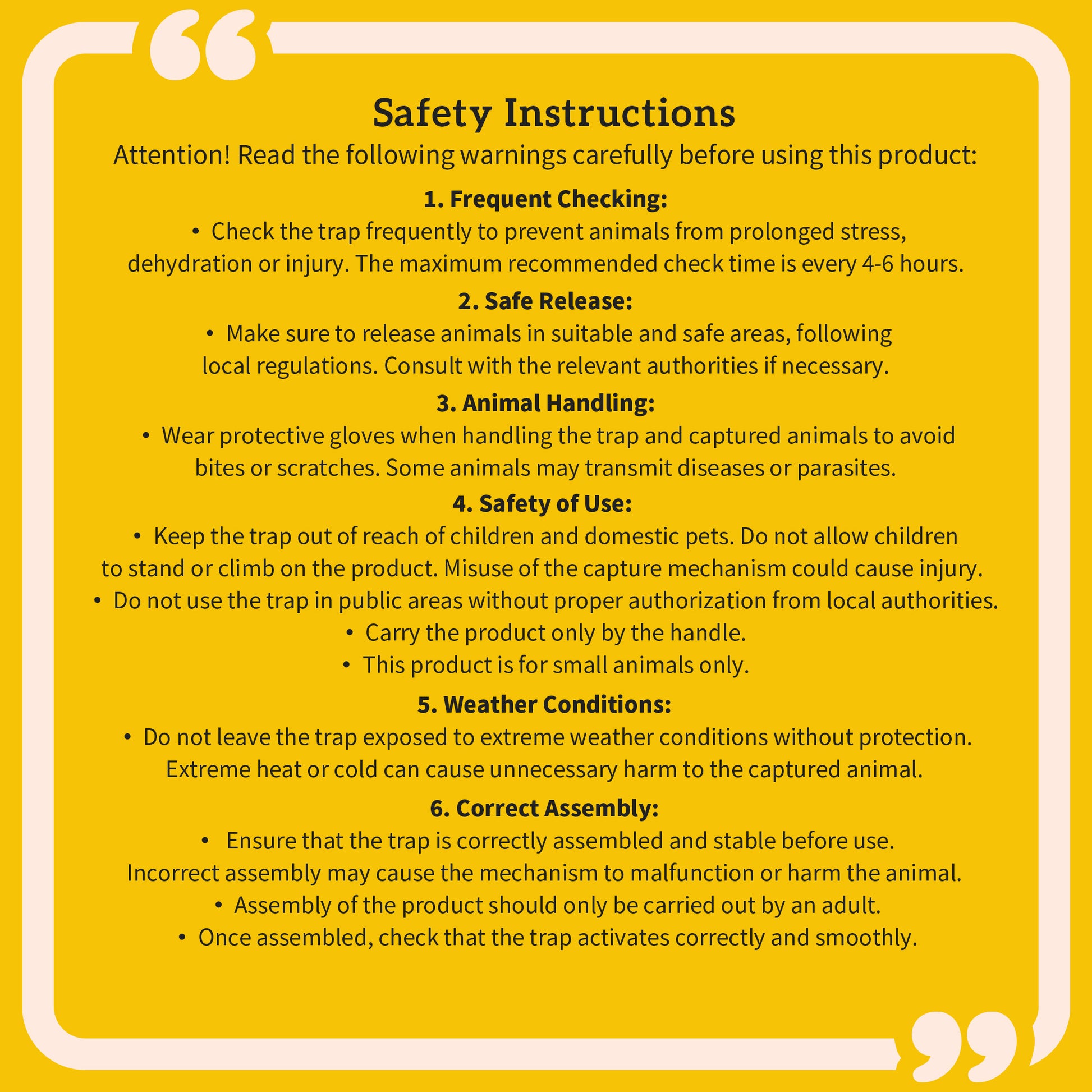 Tired of pests messing with your garden? The animal trap has your back. It safely catches rats, mice and other small critters – no harm done. Built from solid, weather-resistant steel, it's great for outdoor use. Just place it where animals roam, add bait and let it do the work. When triggered, it closes gently but firmly. No more ruined plants or chewed-up crops – just peace of mind, finally.Specifications