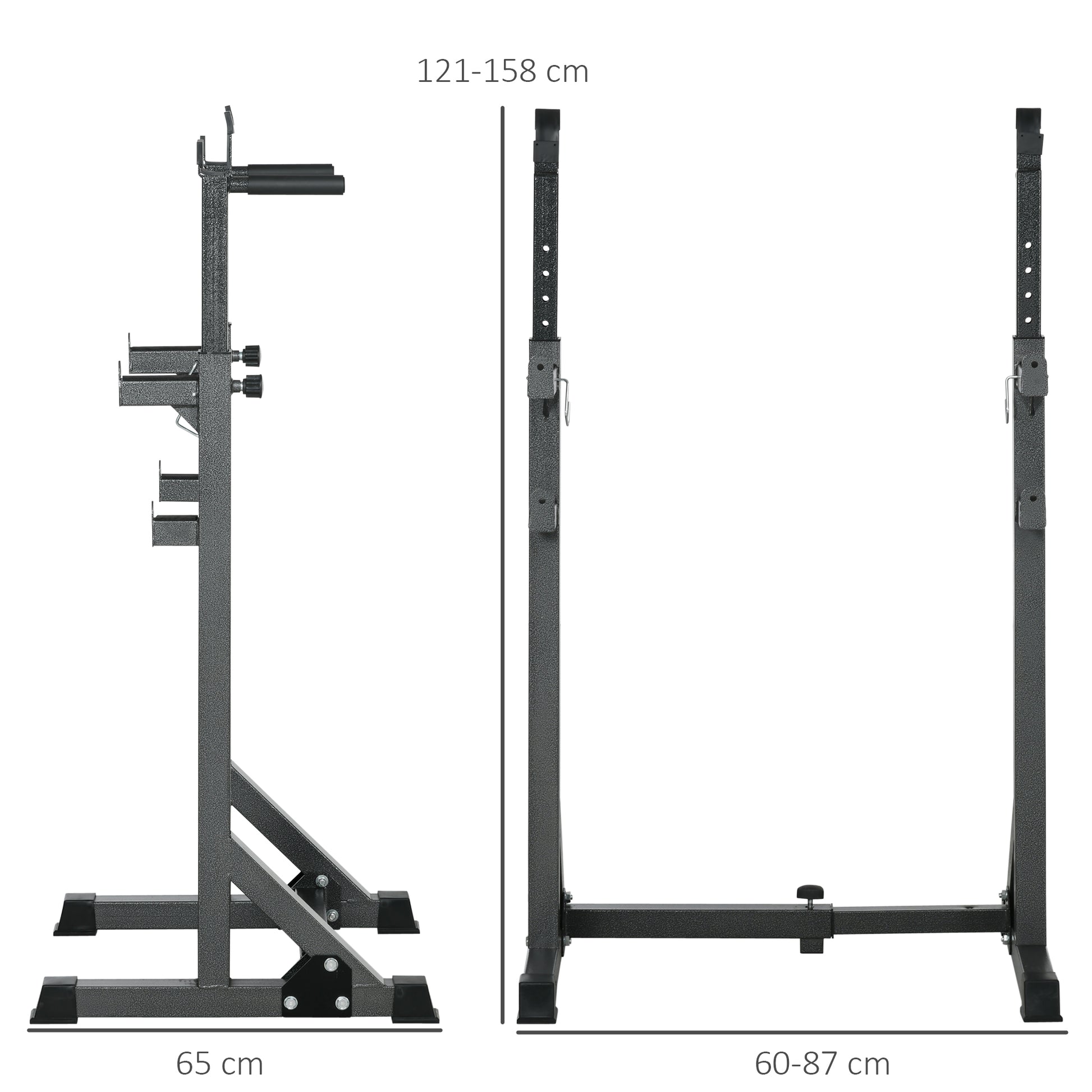 - Adjustable height: The twistable knobs let you change the height between 121-158cm and width between 60-87cm. You'll have this squat rack at a tailored height, so you can exercise comfortably.