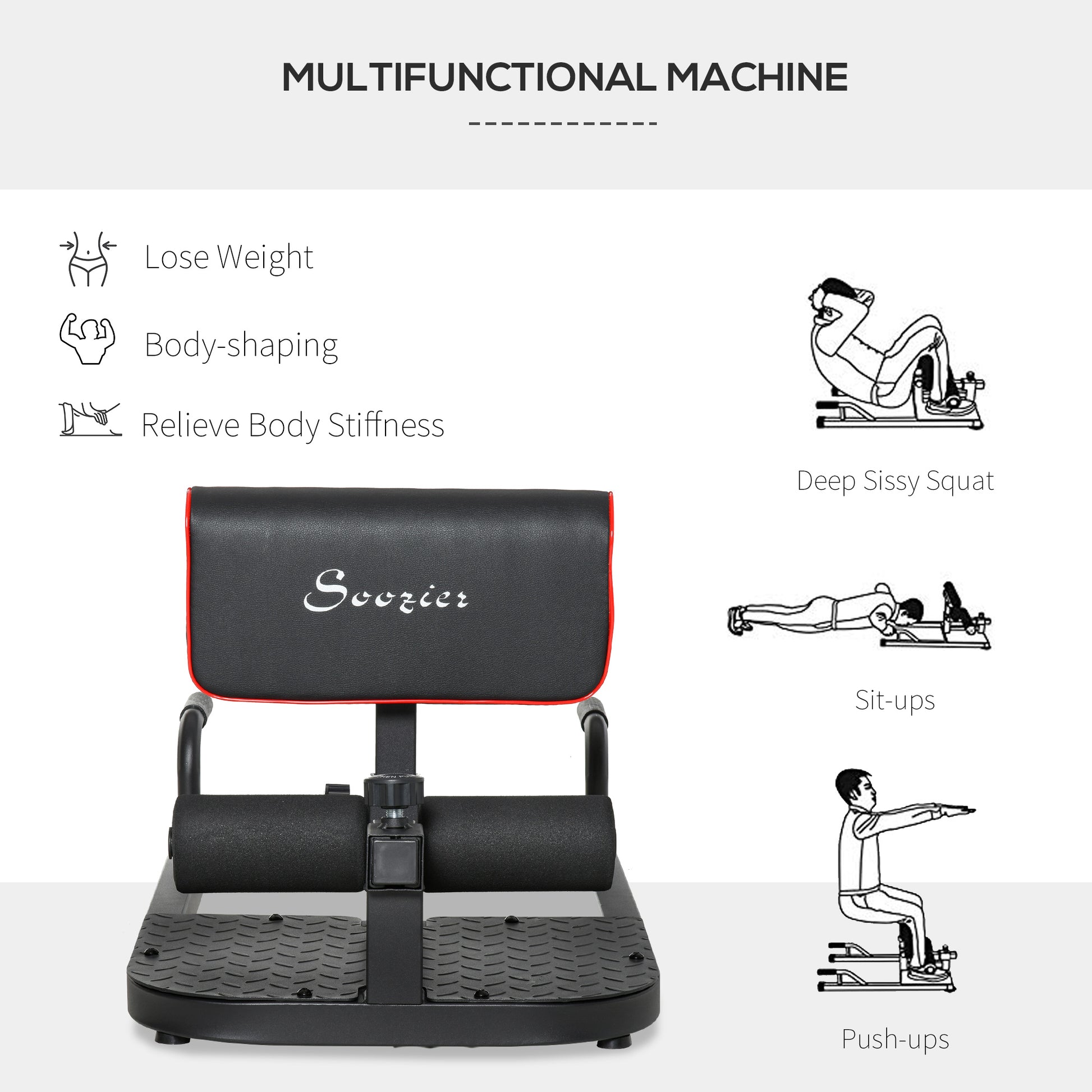 • 3 in 1 exercise machine for deep sissy squats, sit-ups, and push-ups