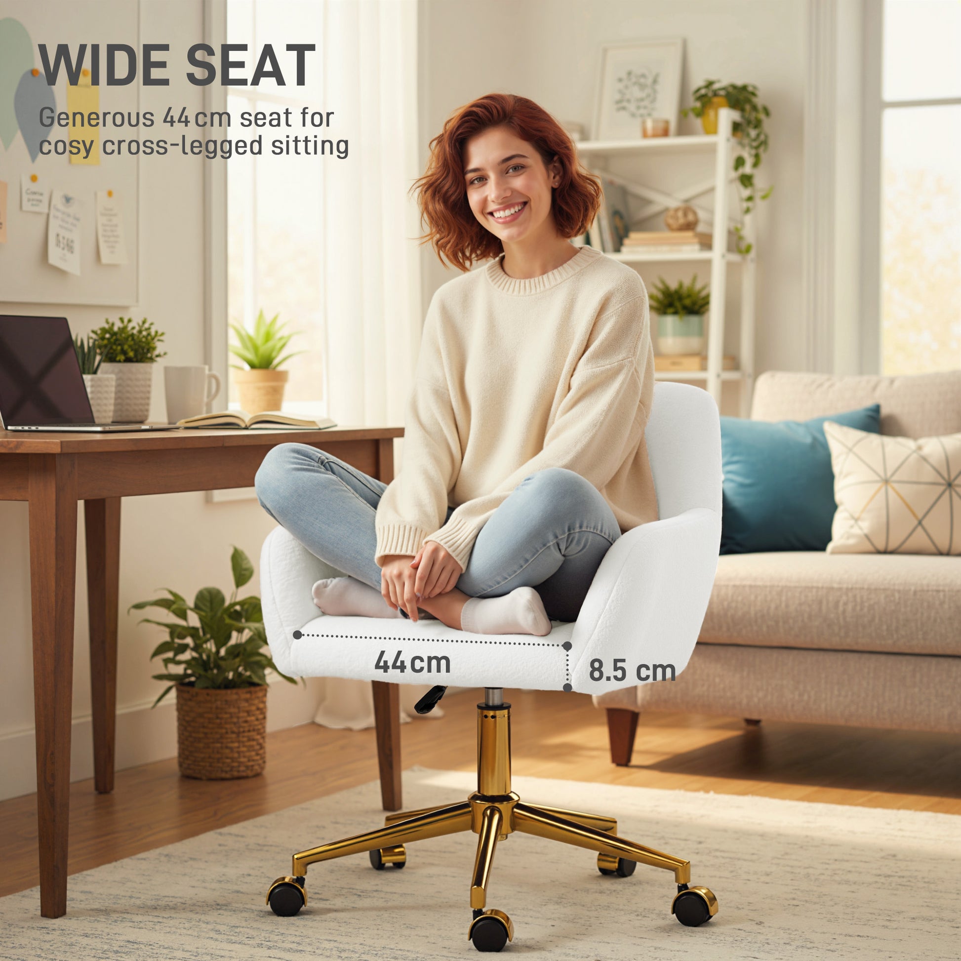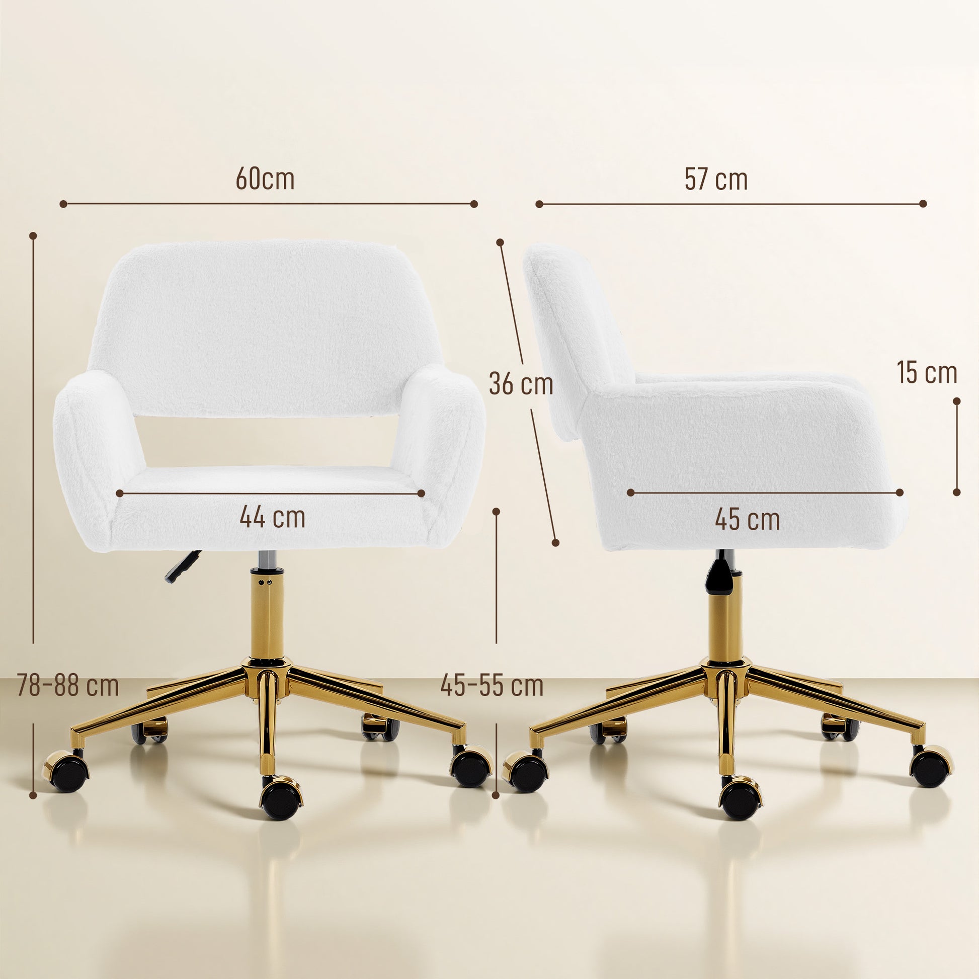 All the softness as you work, all day long - this faux fur office chair. Filled with high-density foam so you can sit and work comfortably, whilst the shape retains to use everyday. Wrapped in faux fur upholstery, this is a soft and plush piece - love using it as much as having it a part of your space. Complete with five wheels to move this desk chair around easily.Specifications