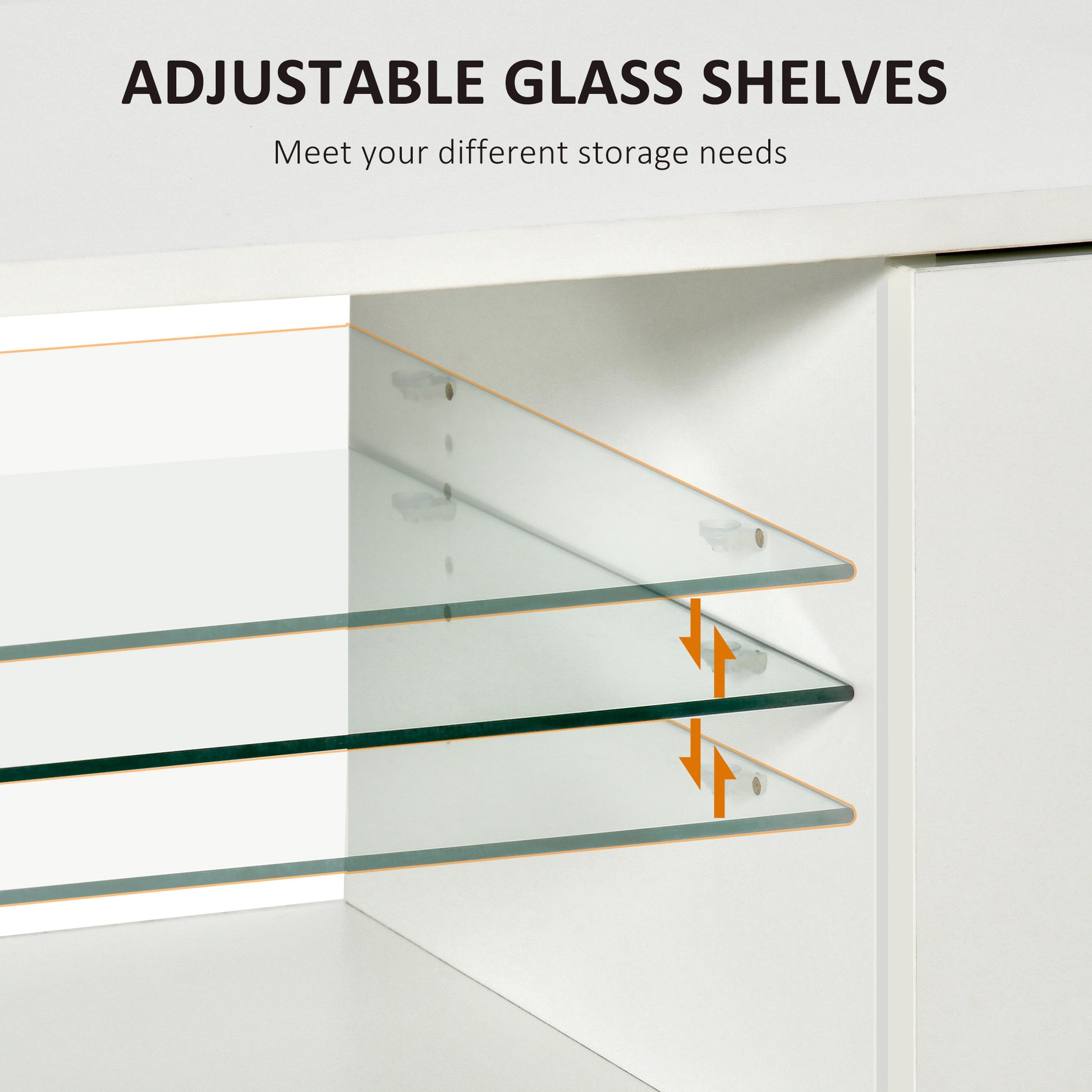 A fun and funky way to keep your TV displayed in the living room and beyond - this modern TV unit from HOMCOM. It comes with LED lights in the middle compartment: 16 different shades over four changeable modes - perfect for bringing a cool atmosphere to your movie nights and more. There are two end cupboards and a middle glass shelf for plenty of storage. Made from particle board, the structure is durable and will support your media devices, completed with a beautiful high gloss finish.