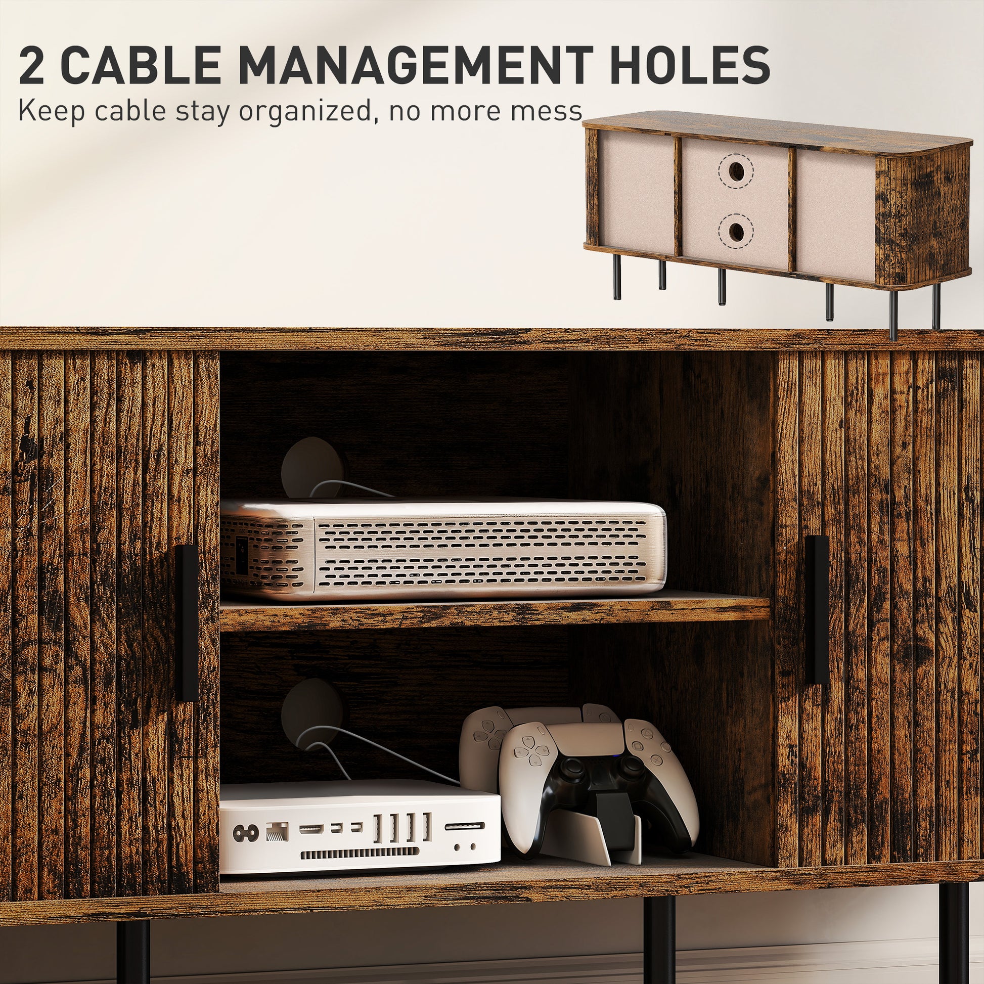 Upgrade your living room with this TV table stand for 55 inch TV. This wooden TV stand does more than holding your TV, it has two open shelves and two cupboard with slatted tambour style door to provide lots of storage space for your favourite movies, a collection of video games or books you love to read. There are two cable holes for organising wires without the mess. Without a doubt, it will be a great companion for your relaxing moments.Specifications