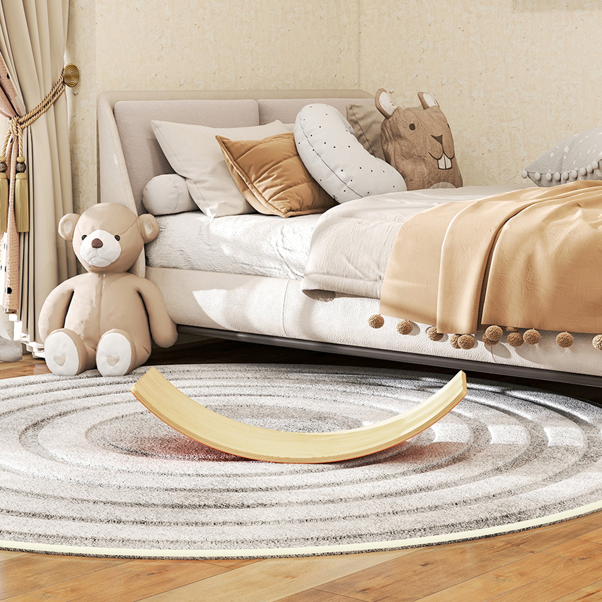 The kids balance board is a simple and effective solution to turn boredom into fun and joy. Suitable for ages 3-8 years, children can creatively use it as a bridge, slide, seesaw or rocking chair. The orange felt base reduces noise and provides a non-slip surface for added safety. Made from solid natural wood, it's not just a toy but also helps in developing balance and coordination, encouraging active play and joyful moments at home.Specifications