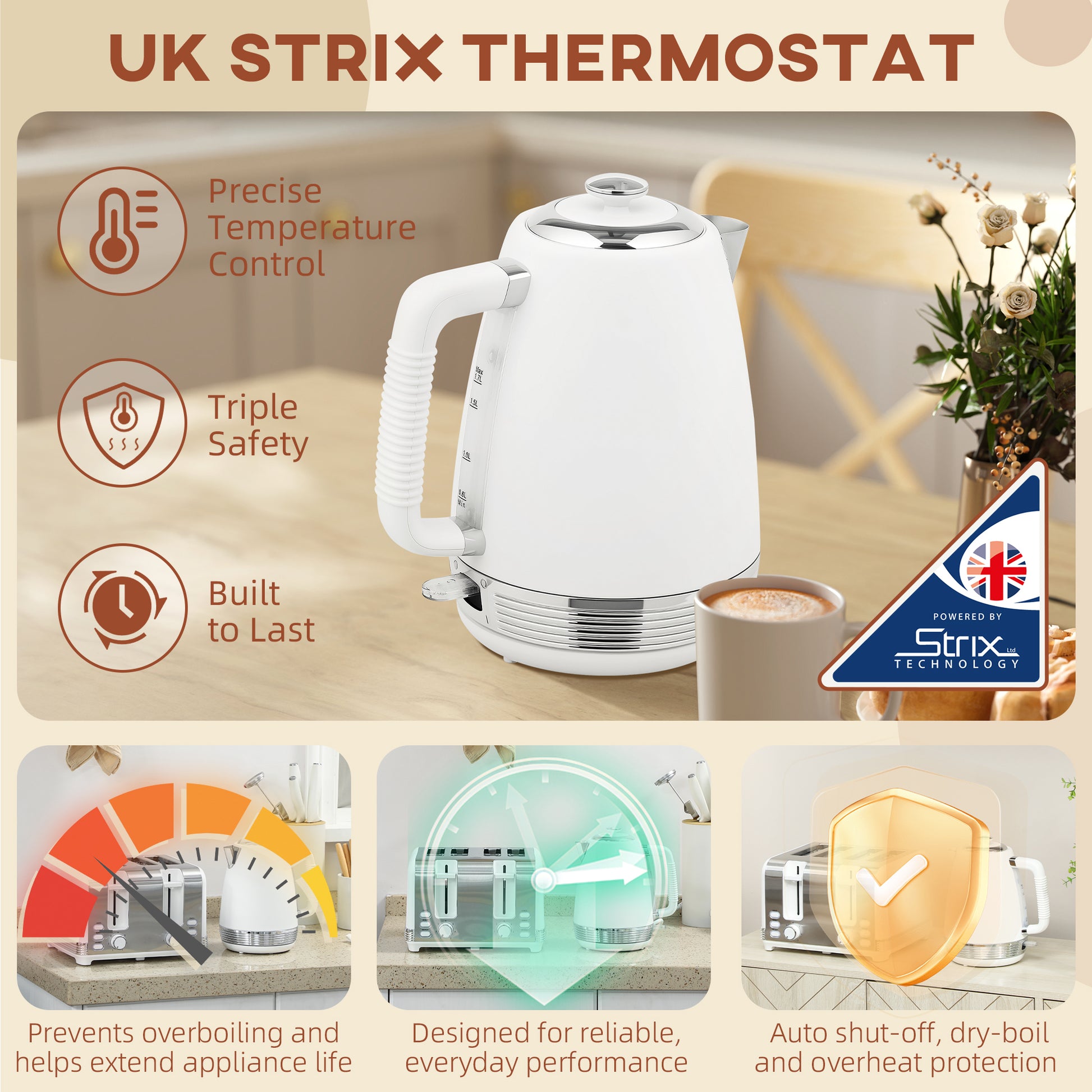 - Kettle with UK Strix thermostat for precise temp control and safety