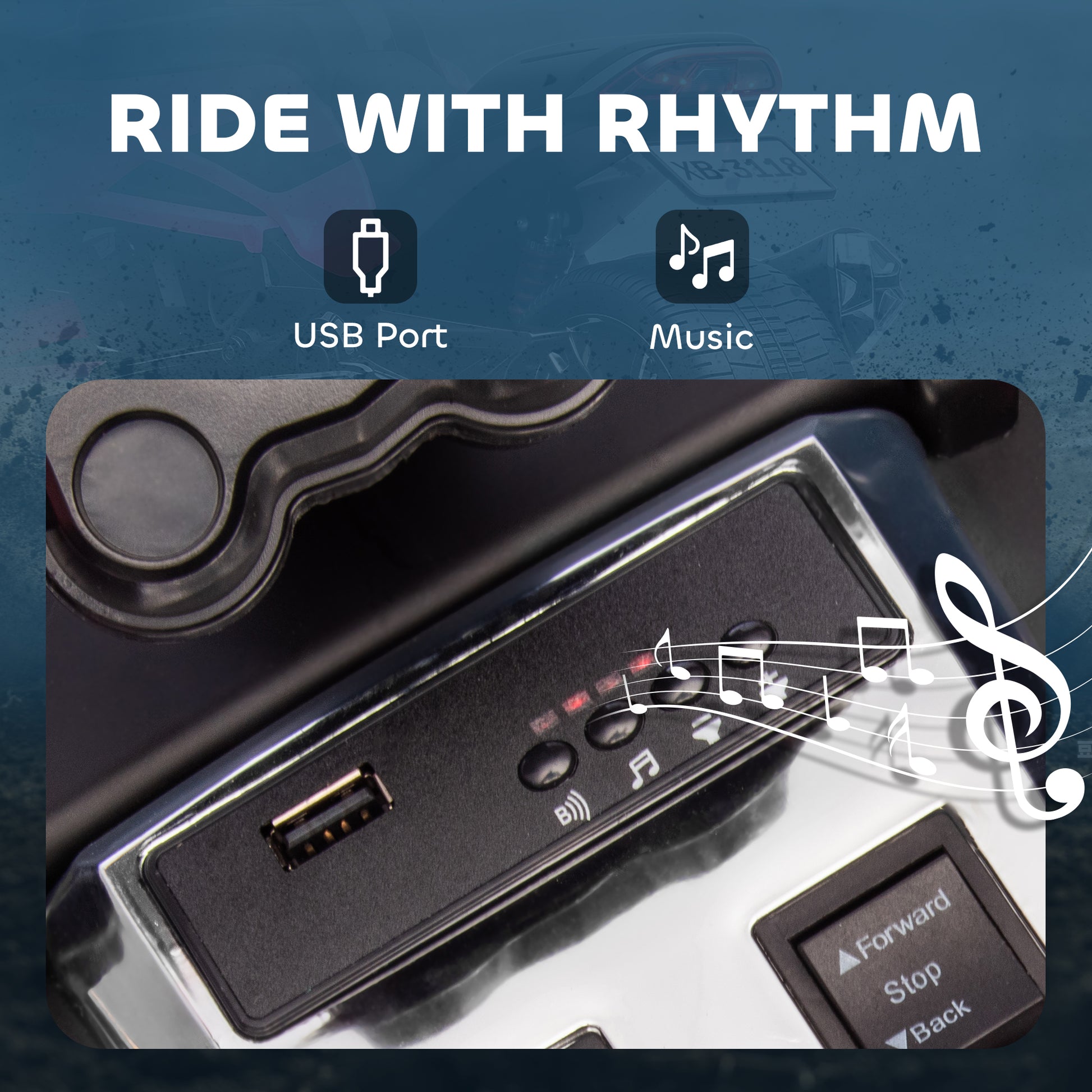 Adventures start with the kids electric ride on ATV – a cool reverse trike design that makes kids feel like real explorers. Two 12V motors and suspension keep rides smooth at 3–5km/h. Built-in USB lets them play their favourite songs, while front and rear LED lights light the way for added fun and realism. It's a ride made for excitement, confidence and imagination.Specifications
