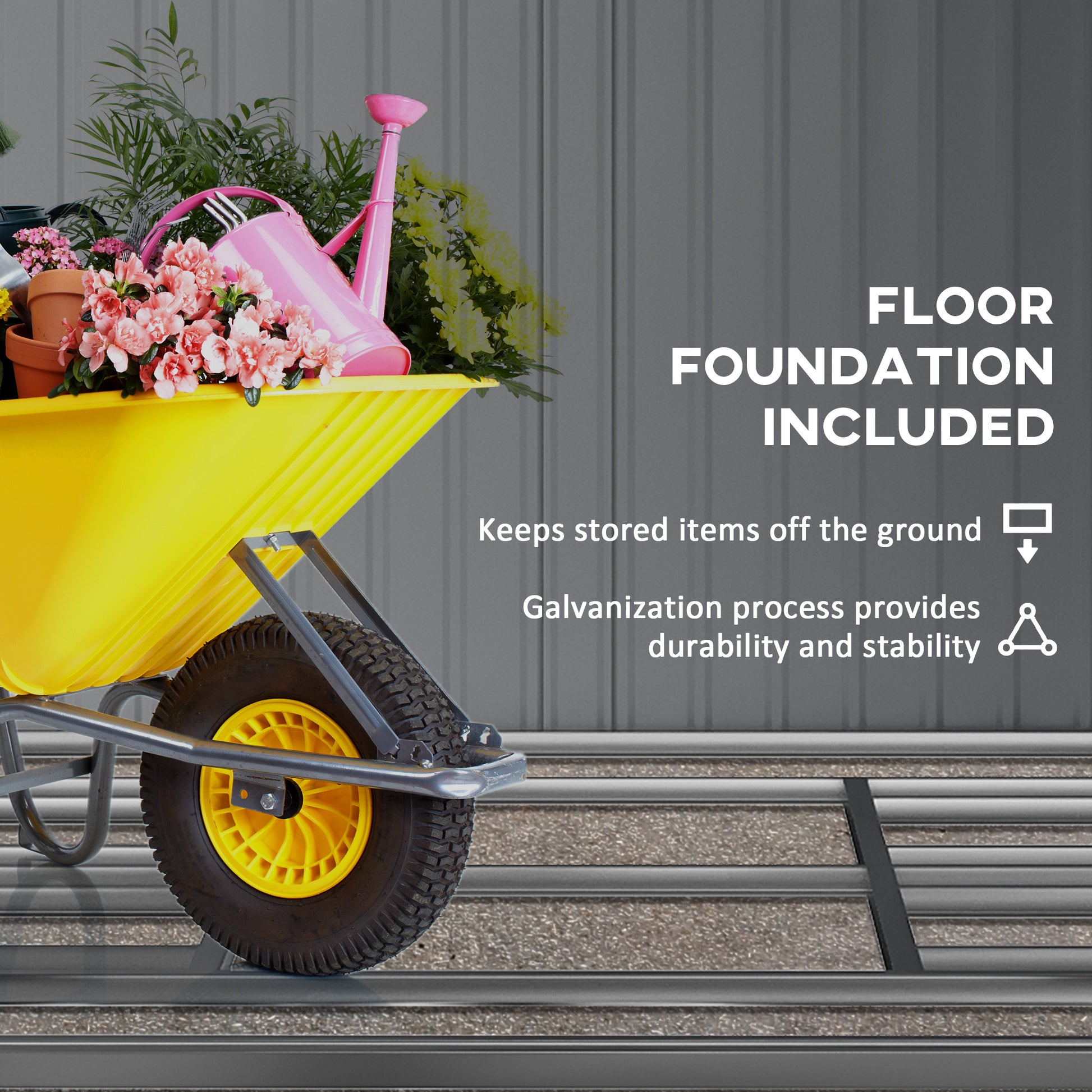 Keep your garden equipment and outdoor essentials locked away securely with this metal shed . Built from galvanised steel for strength, it comes with a lockable double sliding door on the front for easy access and four vents for air to circulate and prevent moisture buildup. The garden tool shed is finished with a protective weather coating and a floor foundation for it to stand level on the ground.