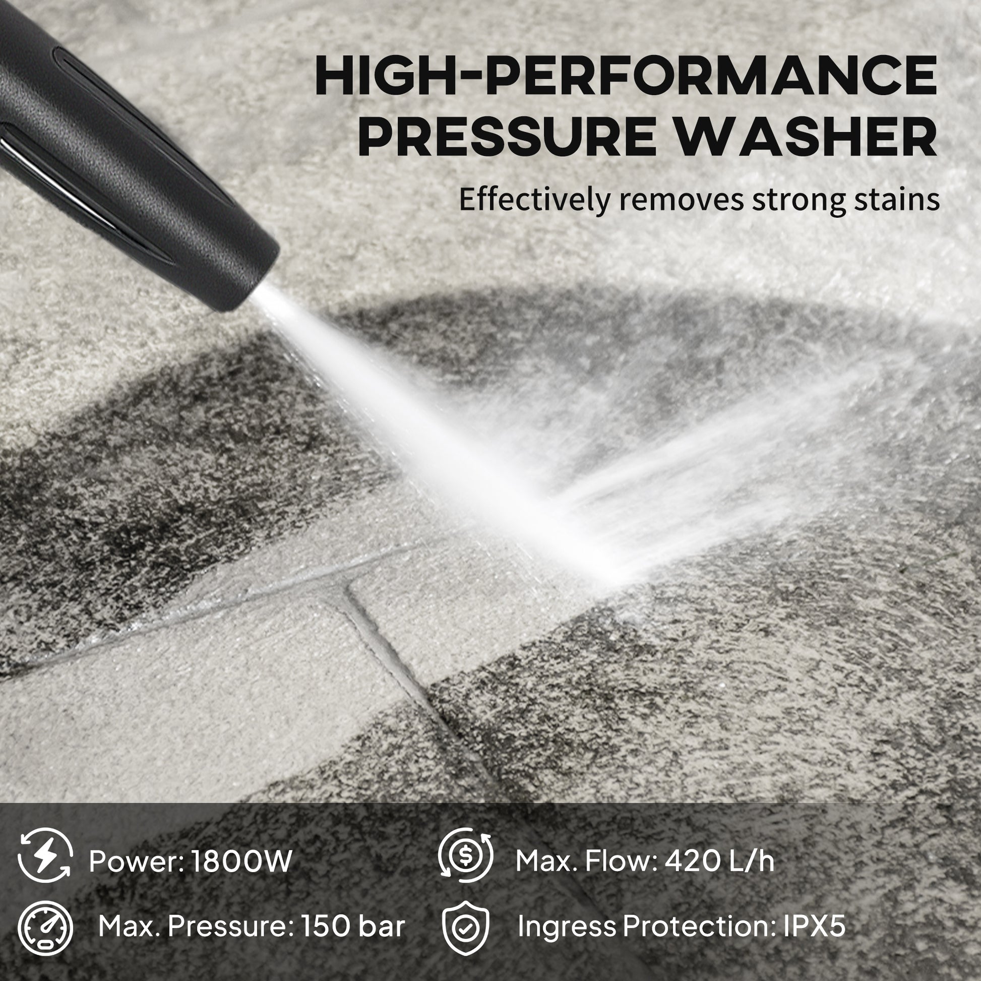 Easy home cleaning of stubborn tasks - this portable high pressure washer. The 1800 W motor and 150-bar pressure is powerful - provides 420 litres of water per hour for superb cleaning that deals with a variety of dirt and stains. The spray angle adjusts between 0-75°, making it easy to direct the pressured water to a position you require. With the six-metre long hose, five-metre long power cord and wheels, you can move it around and reach long distances easily.Specifications