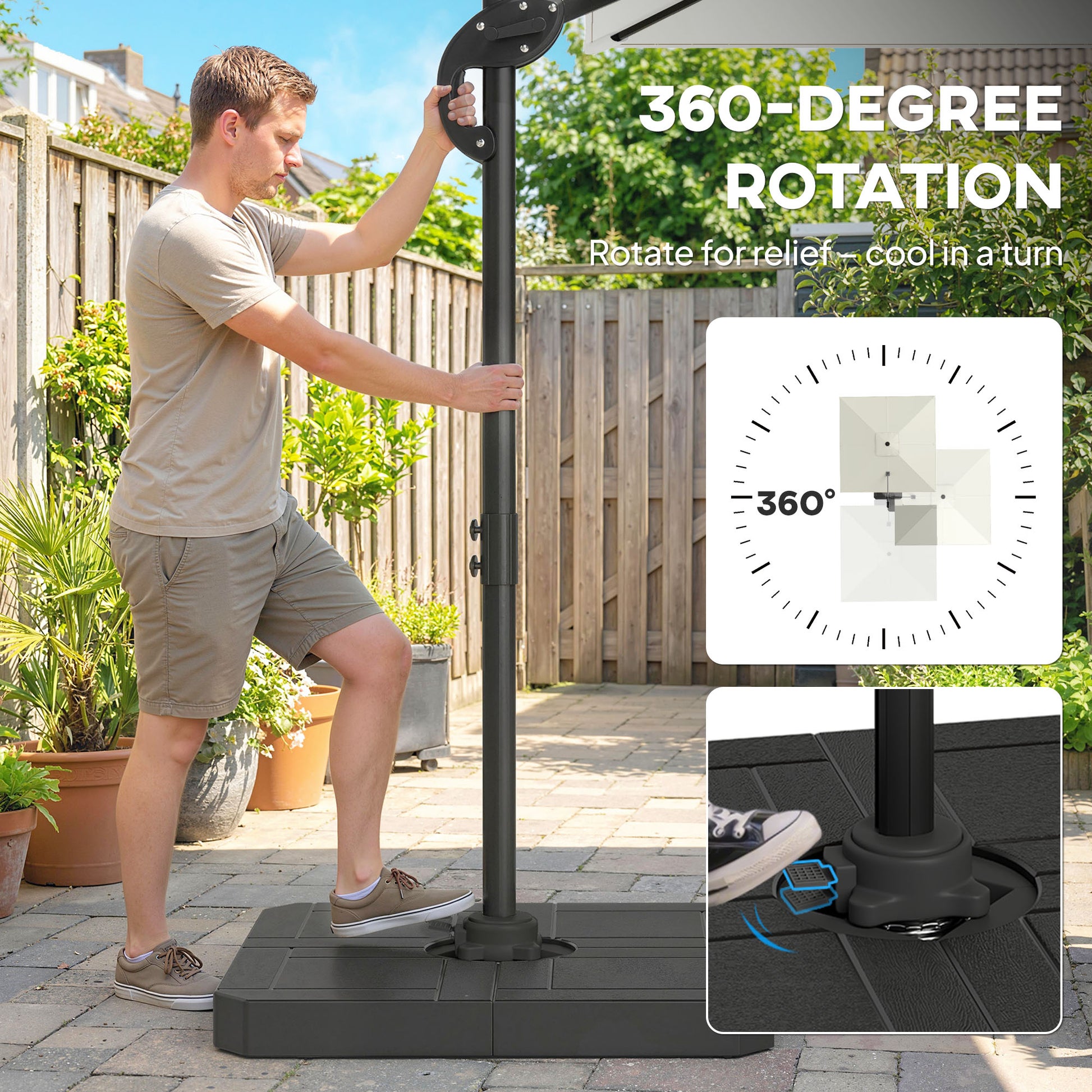 Enjoy effortless shade with this cantilever garden parasol with base weights, designed for flexible comfort on sunny days. The fade-resistant 200 gsm polyester canopy with UPF50+ protection blocks harsh UV rays while keeping colours fresh. With smooth 360° rotation and five adjustable tilt positions, you can follow the sun and create shade where you need it. Even better, fillable base weights are included—no need for extras—so you can set up securely and relax with confidence.Specifications