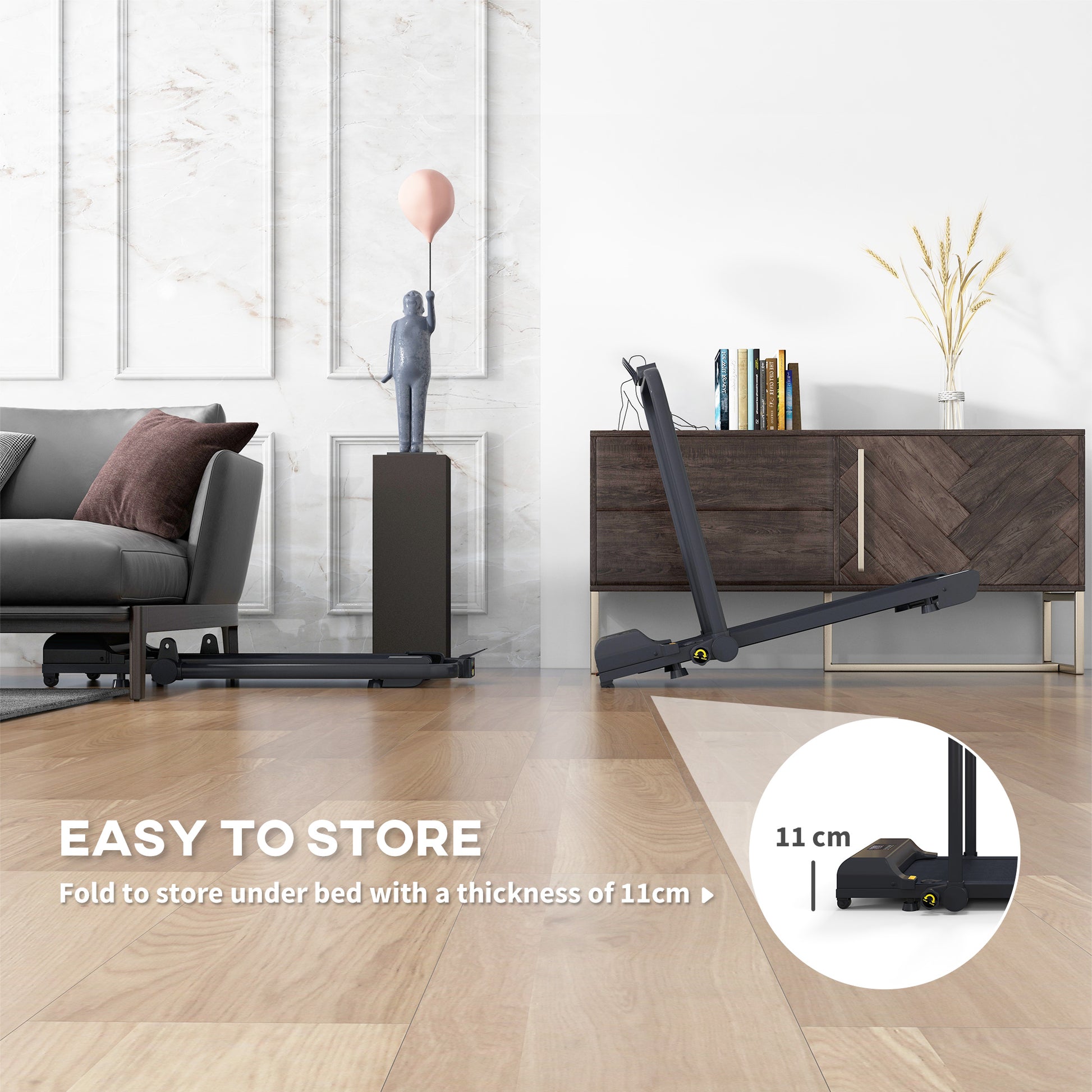 - Dual mode treadmill: running up to 10km/h, walking to 6km/h