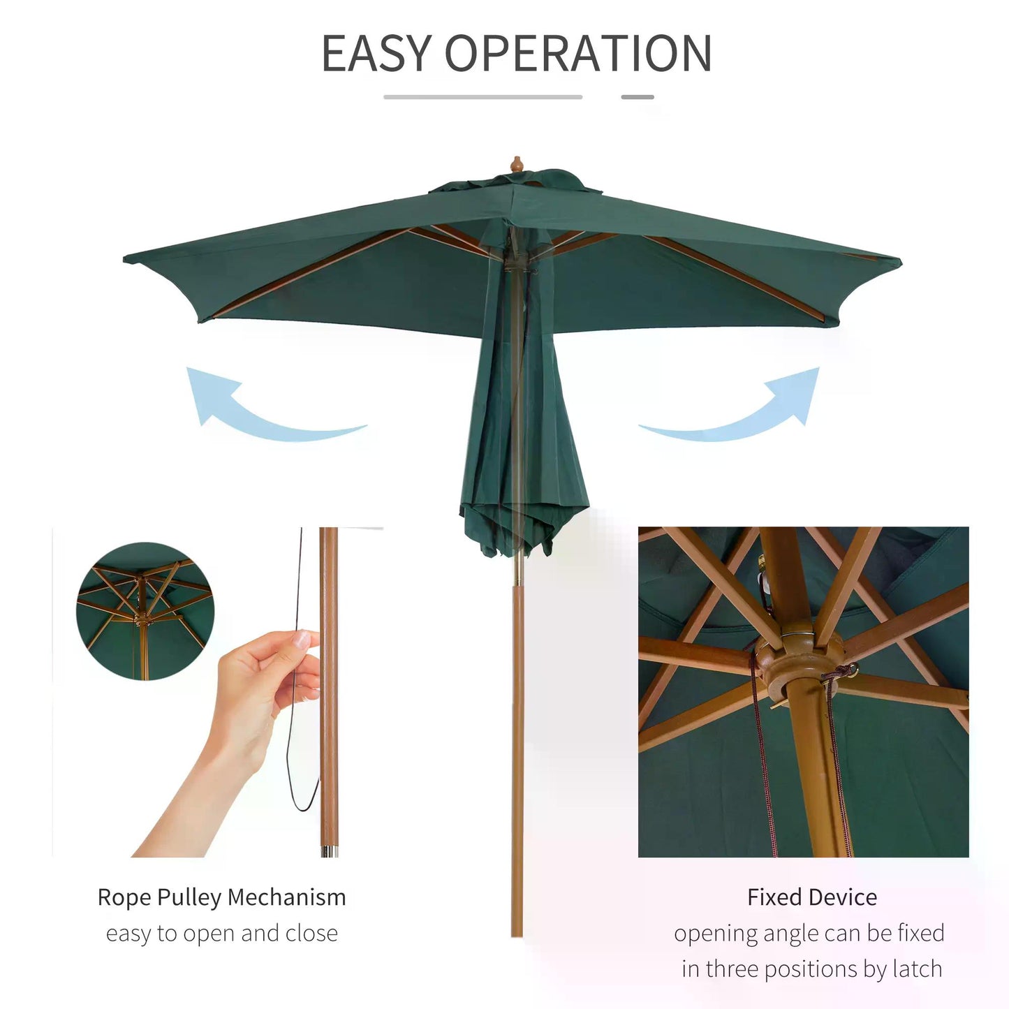 - Easy to use: With convenient design, comes with a rope pulley mechanism for easy opening and closing. The spiral connector method for easy assembly and the outdoor parasol can be fixed in three positions by latch