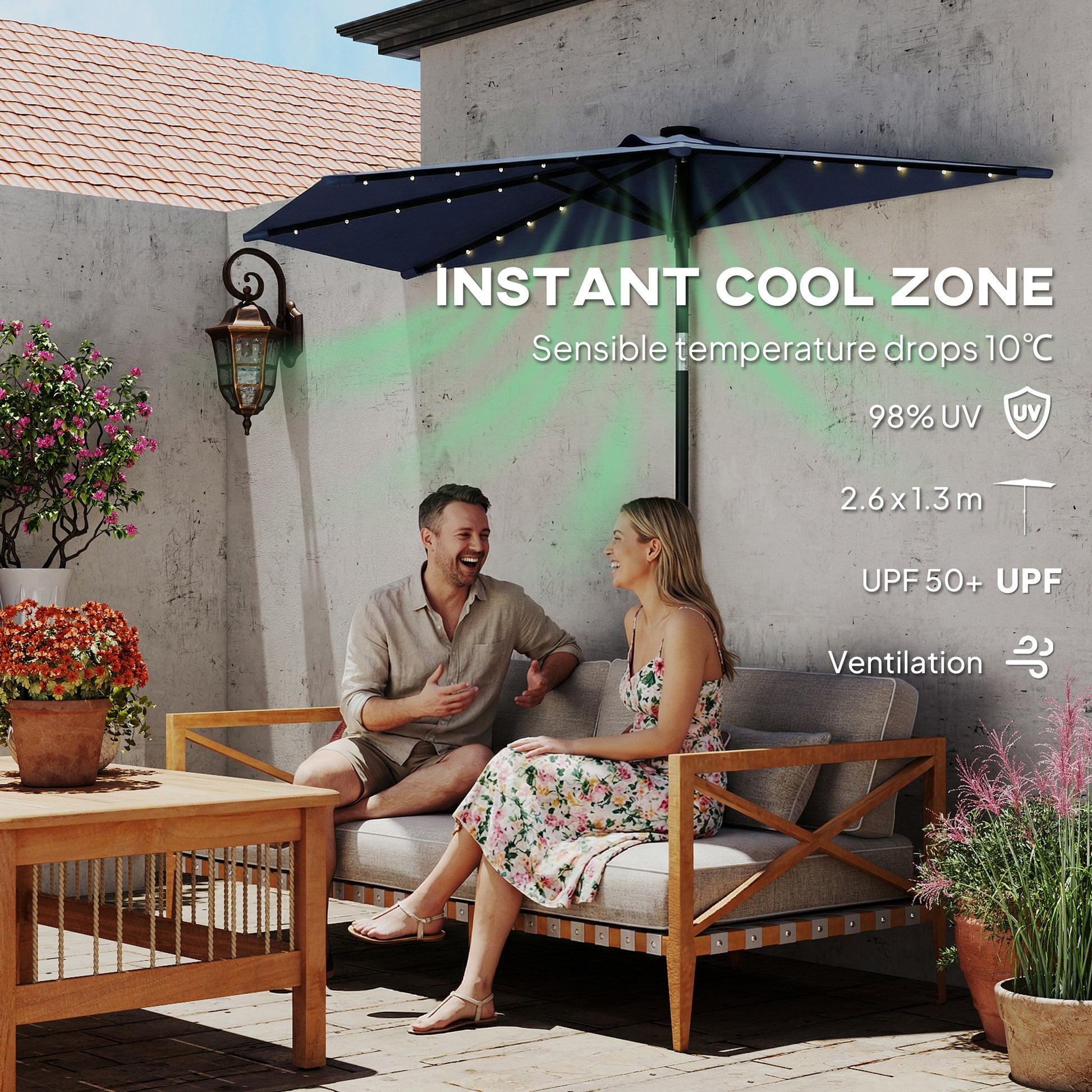 2.6 m Half Parasol with Solar Lights, UPF50+ Semi Round Umbrella