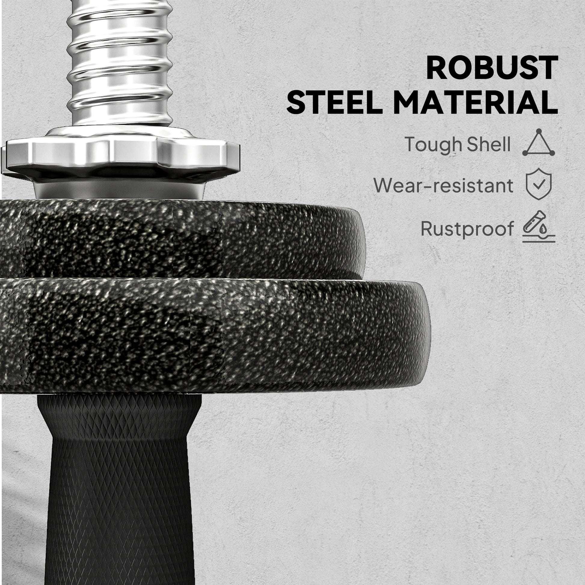 Upgrade your home gym with the adjustable dumbbell and barbell set. Featuring 20 kg of total weight, this set includes 4 x 2.5 kg and 4 x 1.25 kg plates, two dumbbell bars, a barbell bar and four secure spinlocks. The knurled steel handles provide a firm, anti-slip grip, while the robust, solid steel plates ensure long-lasting use. Easy to assemble and compact for storage, it's great for beginners and strength trainers alike.Specifications