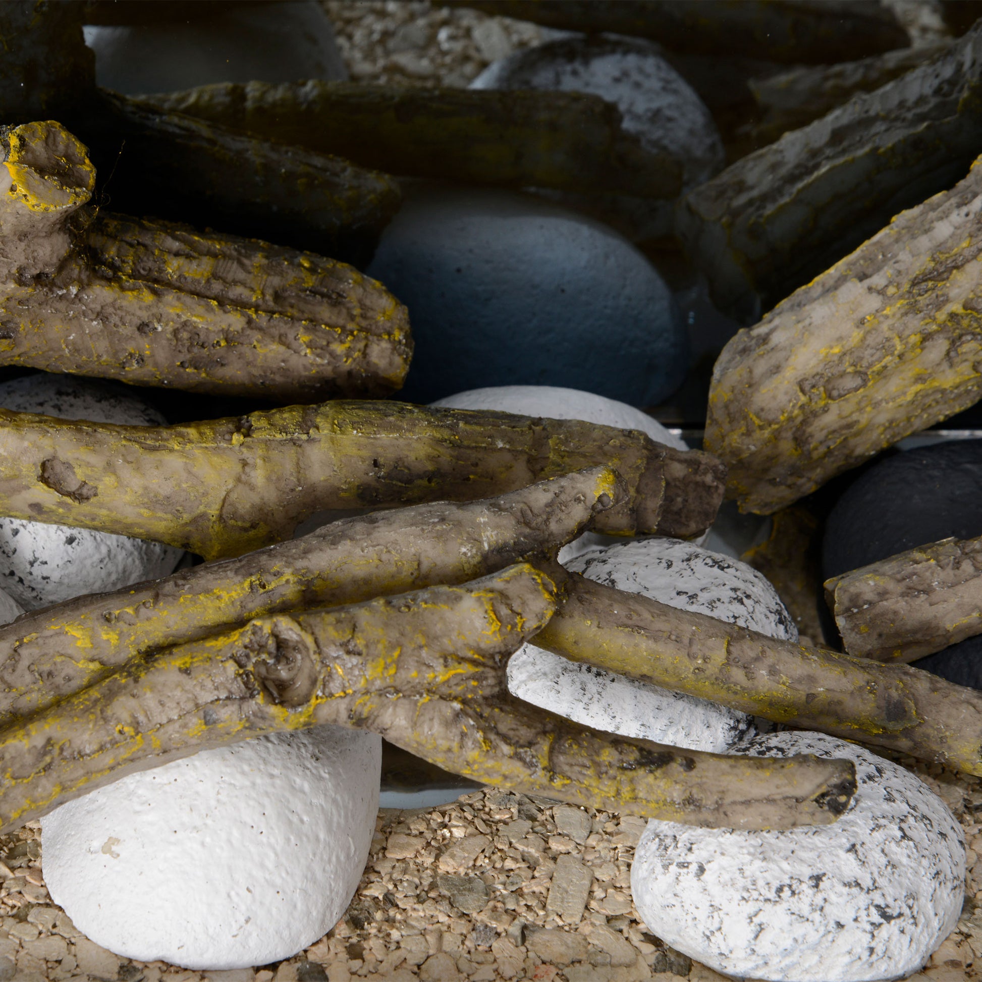 - White mantel with pebble and carbon log, three-sided glass enhances beauty