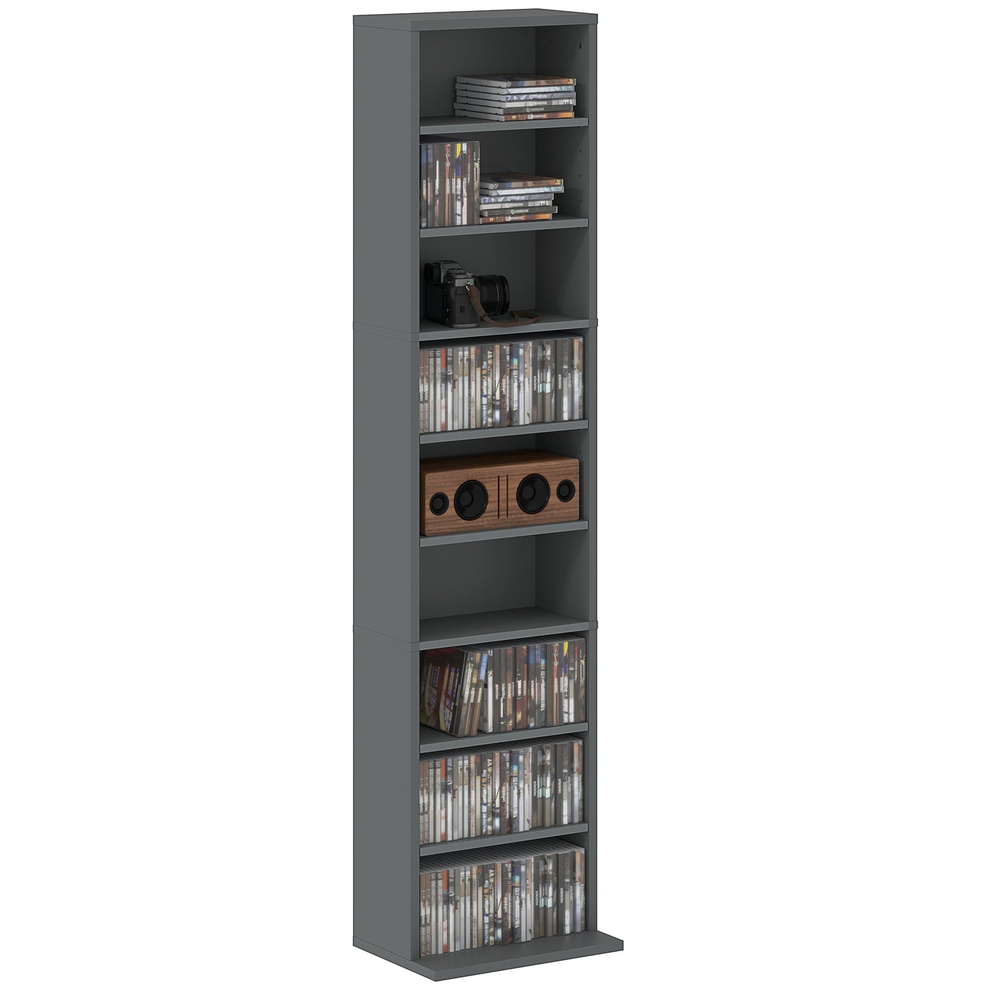 An easy and simple solution for keeping media stored, in the home and beyond - this storage unit. It holds up to 260 CDs, or 120 DVDs, with six adjustable shelves for customisable storage. The CD shelf is made from tough particle board with a smooth melamine coating, complete with anti-tipping straps included to secure to a wall.Specifications
