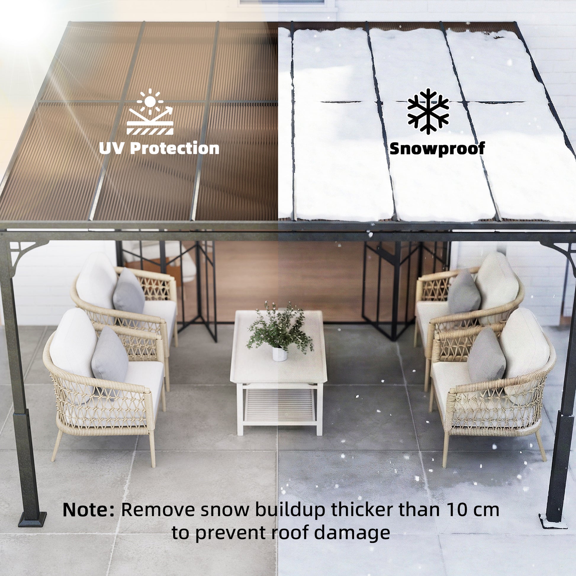 Transform your outdoor space with the Wall-Mounted Pergola. Securely anchored to your wall, it provides a stable shelter with a sloped polycarbonate roof that protects against sun, rain and snow. Its heavy-duty galvanised frame with reinforced columns ensures long-lasting strength, while the spacious design creates the desired spot for BBQs, dining, or relaxing with family and friends year-round.Specifications