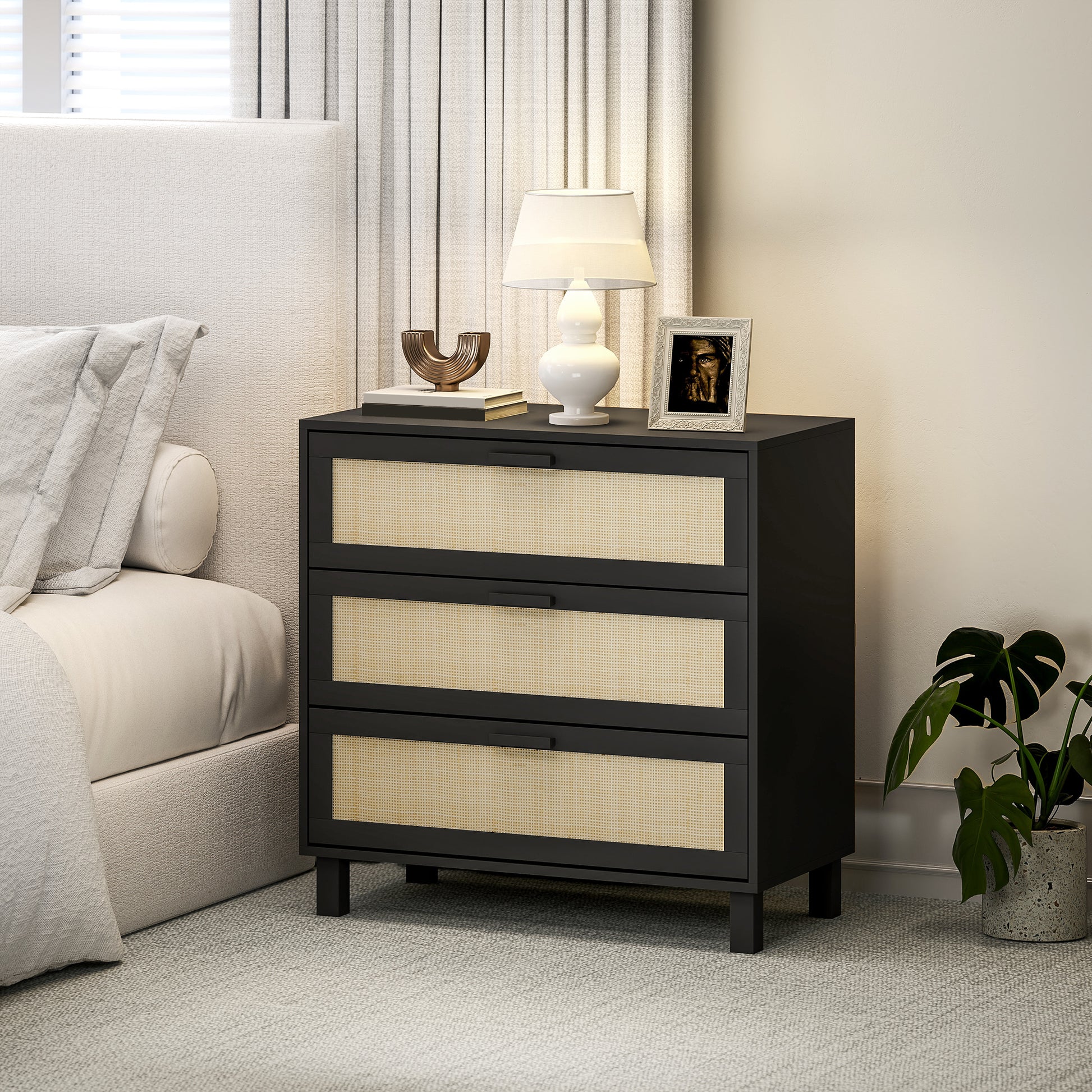 Bring the natural beauty into your inside styling with this tallboy chest of drawers . Here we see woven rattan panels on each drawer, playing contrast to the smooth wood-effect of the structure. The bedroom chest of drawers features three drawers and a flat table top, so there's plenty of storage room. Finished with four small feet to elevate and long handles to open and close the drawer unit easily.Specifications