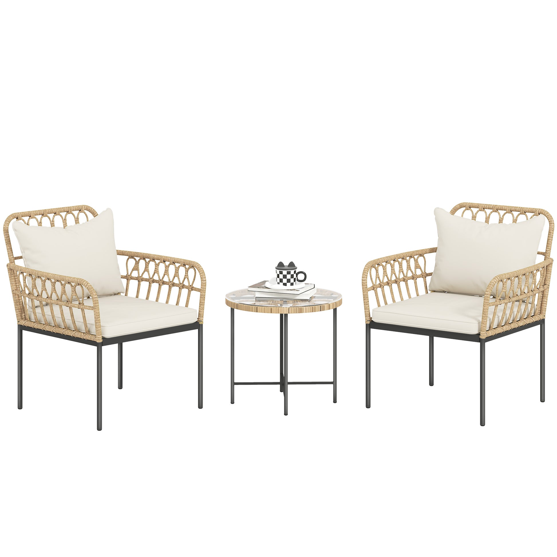 Spruce up your outdoor space with the rattan patio furniture set, featuring a round table and two chairs. Crafted from all-weather PE rattan with strong steel frames, this outdoor table and chairs set resists rust and UV damage. Enjoy comfy seating with thick cushions and a tempered glass-top coffee table that's a breeze to clean. Suitable for any garden, balcony, or patio!Specifications
