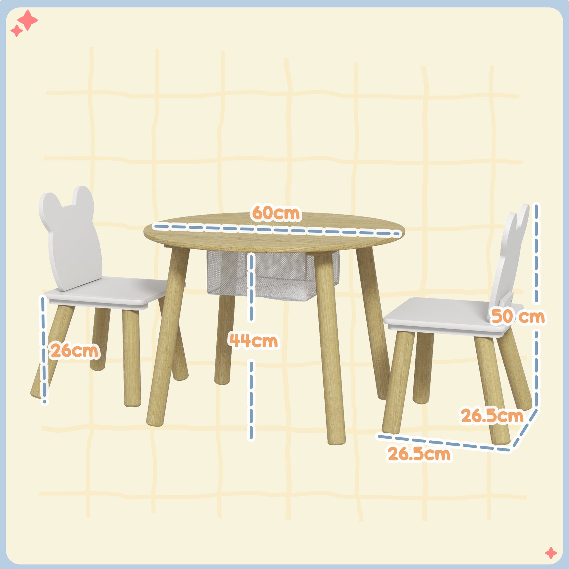 Discover the charm of the toddler table and chair set! This delightful trio includes an activity table and two chairs, great for arts, crafts and snack time. Lift the table cover to reveal a handy mesh bag, transforming it into a neat kids desk or reading spot. Plus, the cute bear-shaped backrest adds a whimsical touch to any nursery or daycare.Specifications