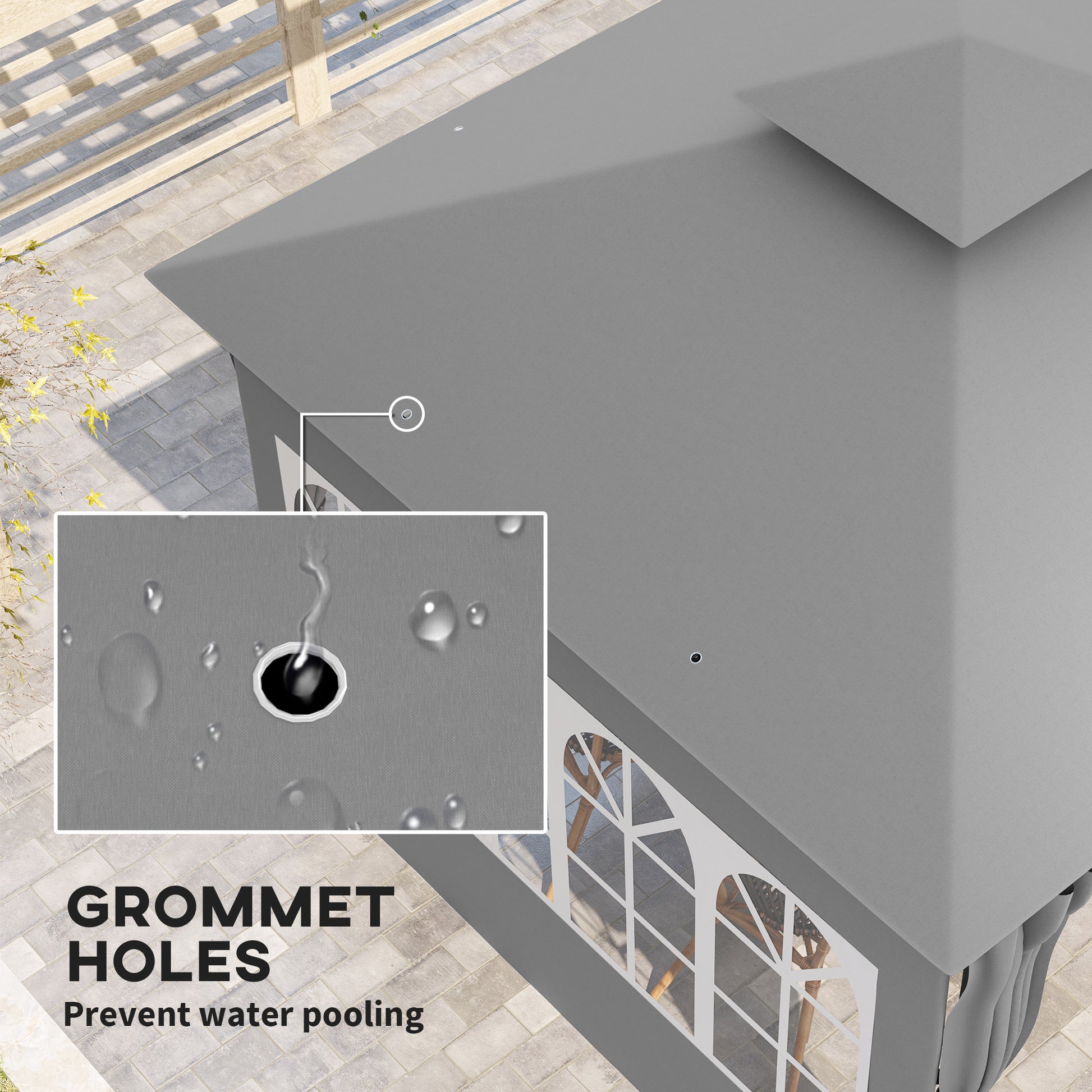 Elevate your outdoor gatherings with the Outsunny 3 x 3 m Garden Gazebo! This gazebo with sides fits 4-6 people and features a PA coated double-tier roof for superior UV protection and enhanced airflow. Splash-resistant material with grommet holes prevents water build-up, while removable sidewalls with clear windows offer privacy and panoramic views, making it a must-have garden shelter.Specifications
