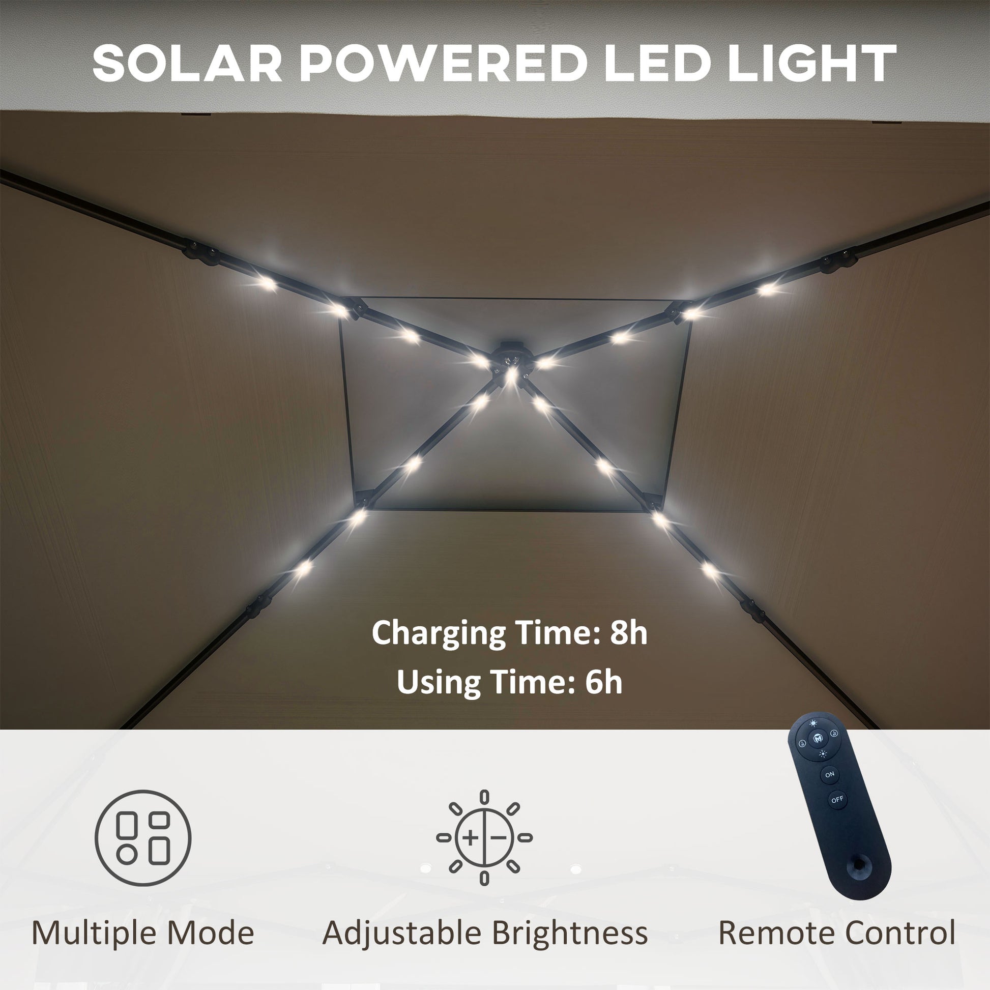 - 16 solar-powered LEDs: Garden gazebo lights charge in the day, to use up at night. Spread across four ribs with four-bead central light. Six hours of light per full charge.