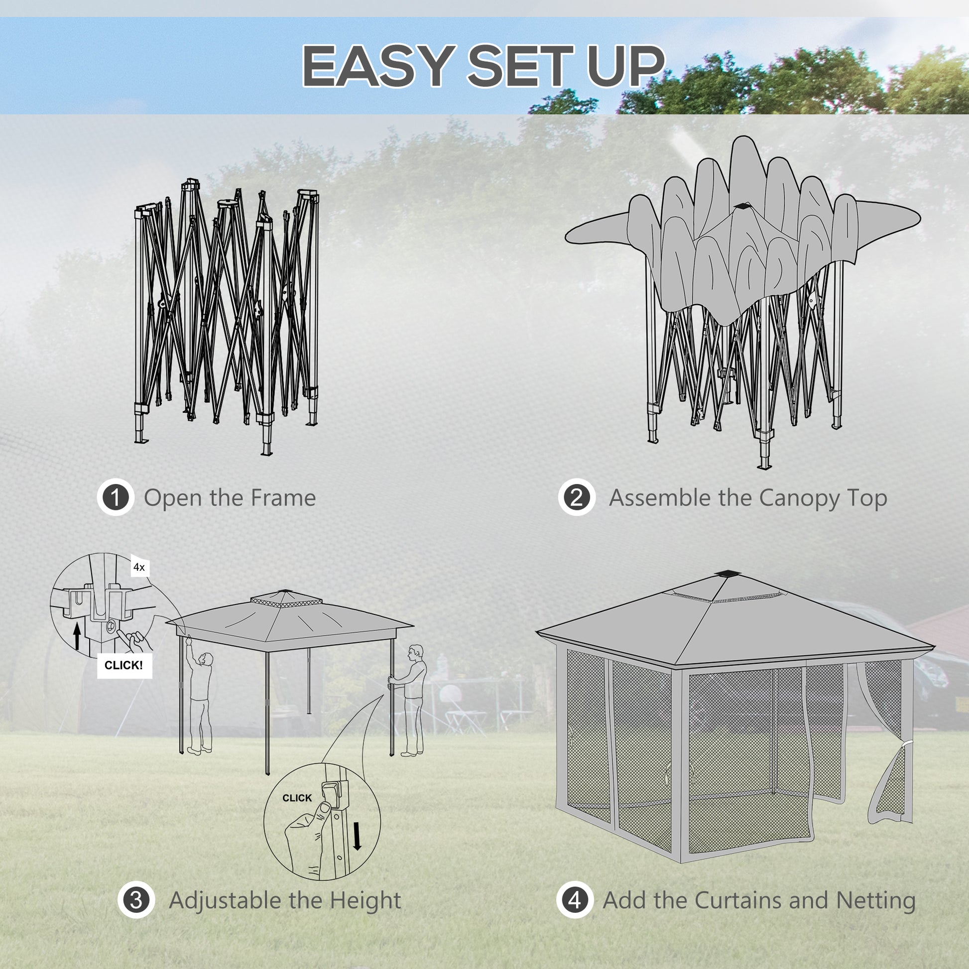 For day AND evening use, look to this Outsuuny pop-up gazebo with sides. It's fitted 16 solar-powered LED lights; charge in the day to use at night - no electricity required. A metal frame for a strong structure, which can be adjusted three positions between 250-270cm. Pop-up design so you can put it up and take down easily; take with you easily, wherever you want. Included remote control for on/off, brightness and mode adjustments. Wheeled carry bag included.
