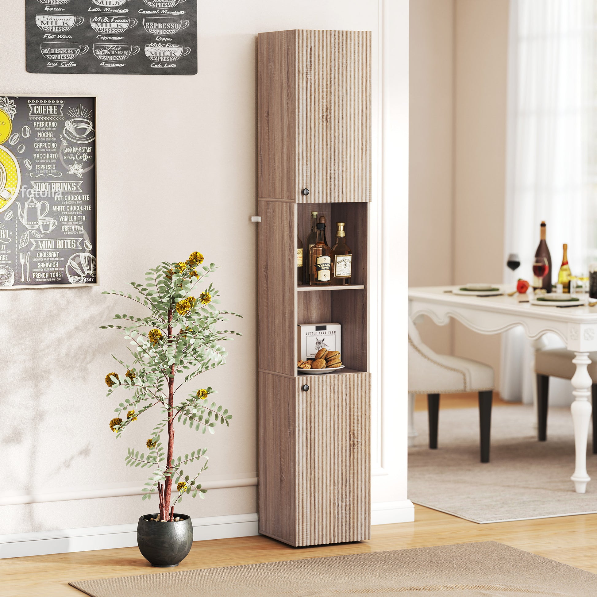 - Tall and slim design perfectly fits small spaces, maximizing vertical storage