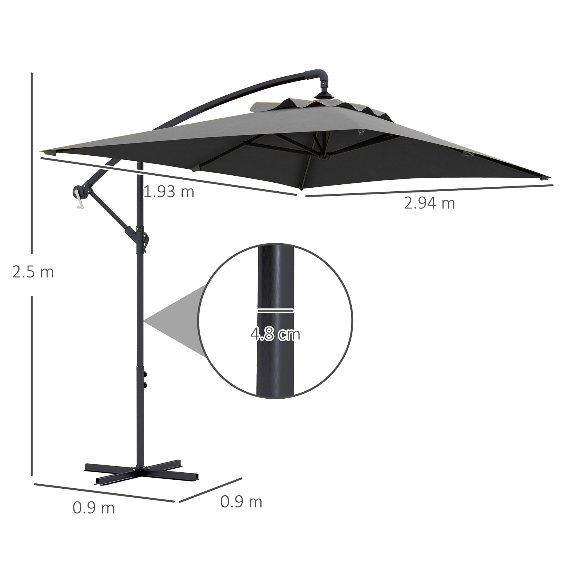 - Steel pole: Powder coated for a strong core, 3(m) cantilever parasol with base included has six ribs on the fabric canopy for extra support.