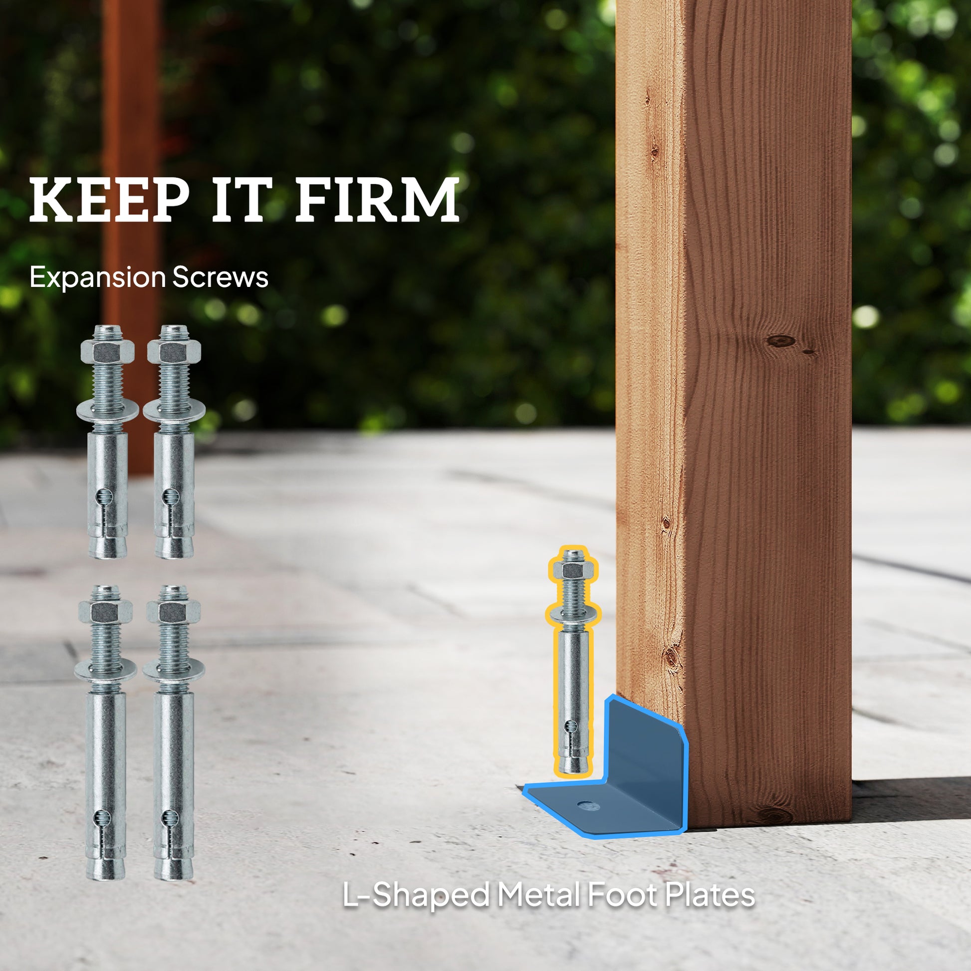 - Comes with L-shaped metal foot plates and expansion screws for stability in up to level 7 winds