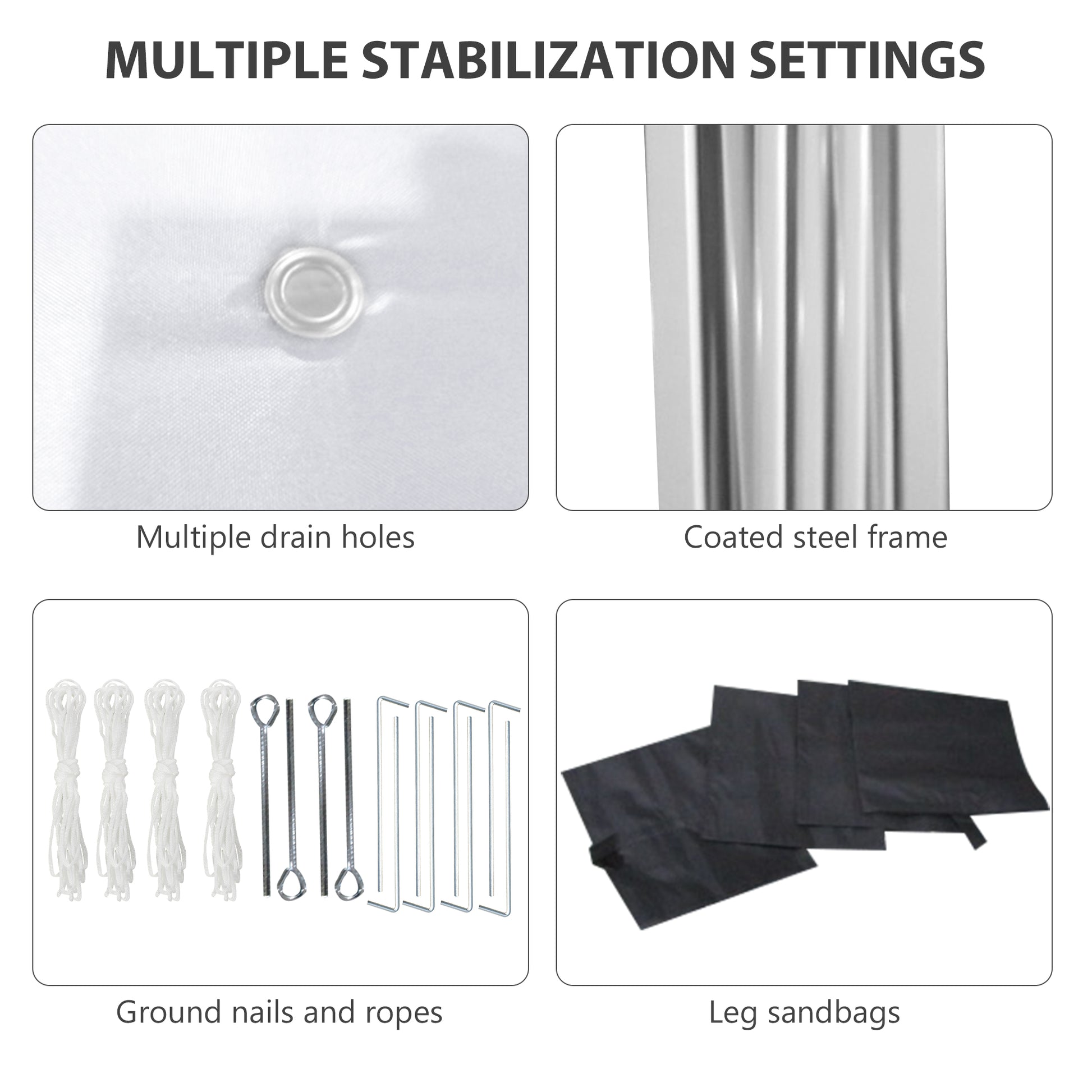 - Guy ropes, ground pegs and sandbags included for extra support and weight