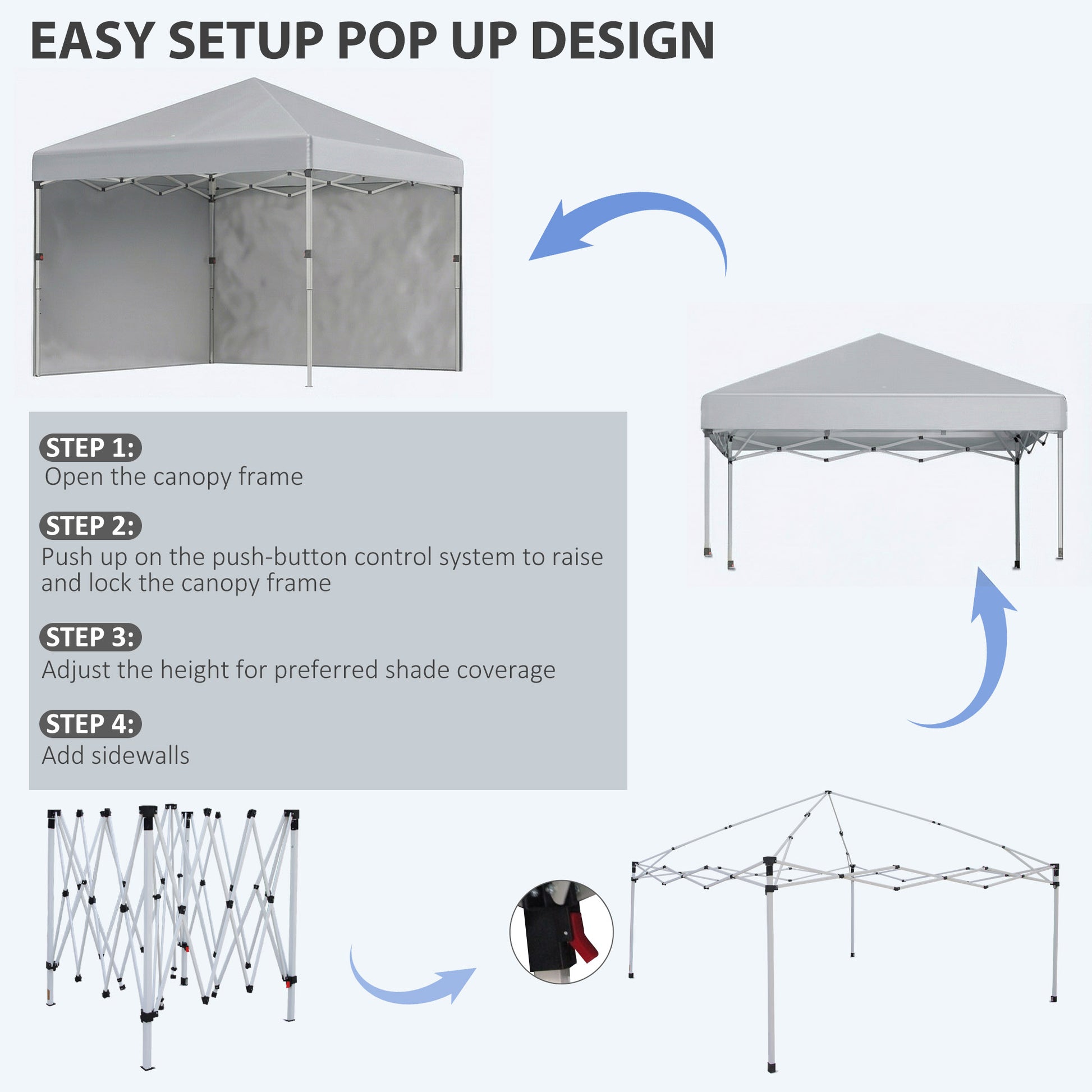 For outdoor trips and beyond, go for this pop-up gazebo with sides. Set between 268cm, 278cm and 288cm. The included stakes, ropes and sandbags stabilise your gazebo on soft ground. Two walls: creating an open-closed mixed vibe. Bag included to pack away and move around easily.Specifications